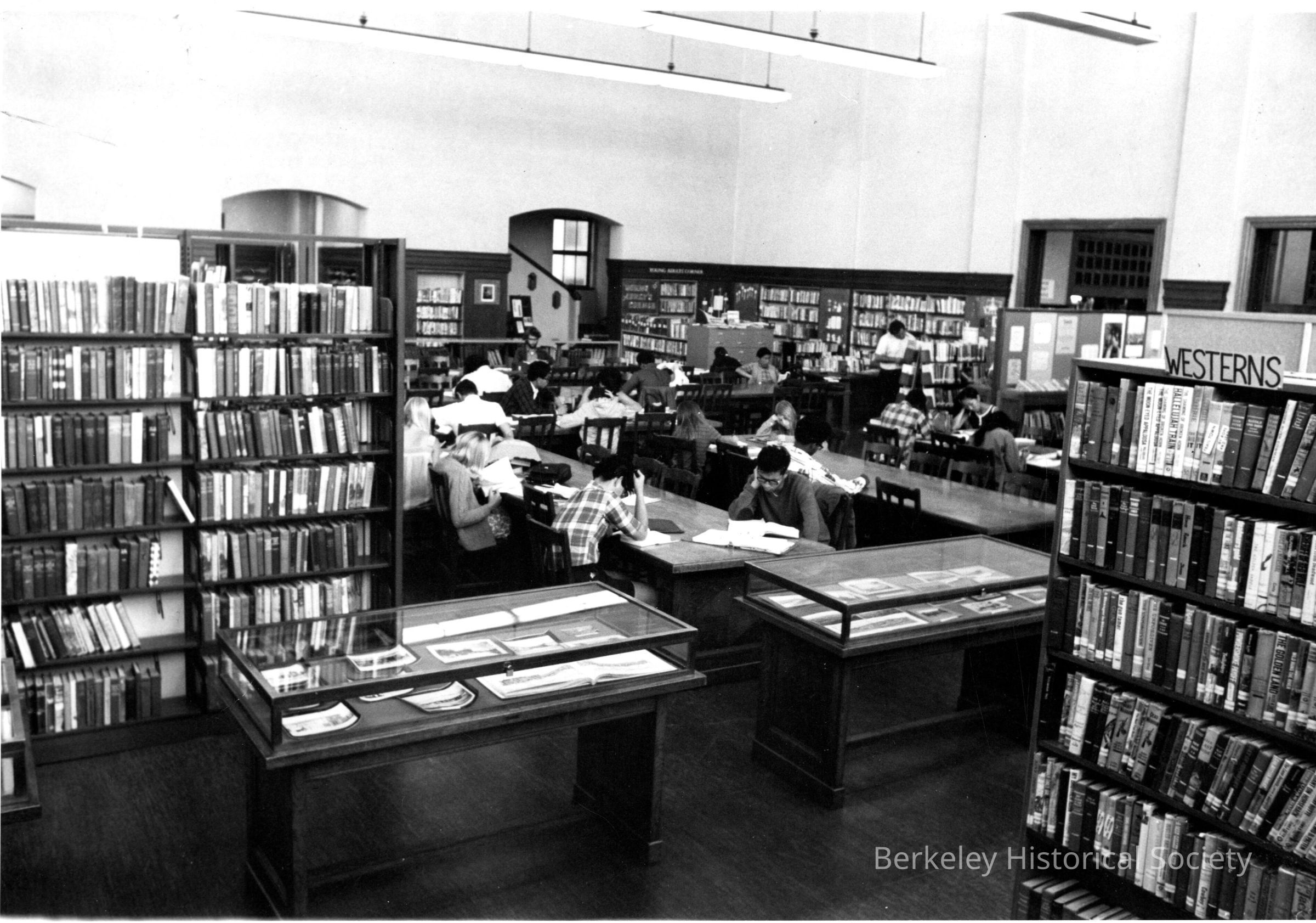 View from one corner of room; display cases in foreground; people at study tables.Other Names and Numbers