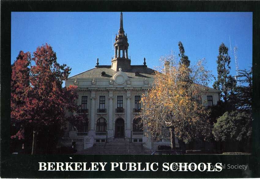 Divided postcard featuring photograph of the administration building of the Berkeley Public School System (formerly Berkeley City Hall) surrounded by a black border. No message present.