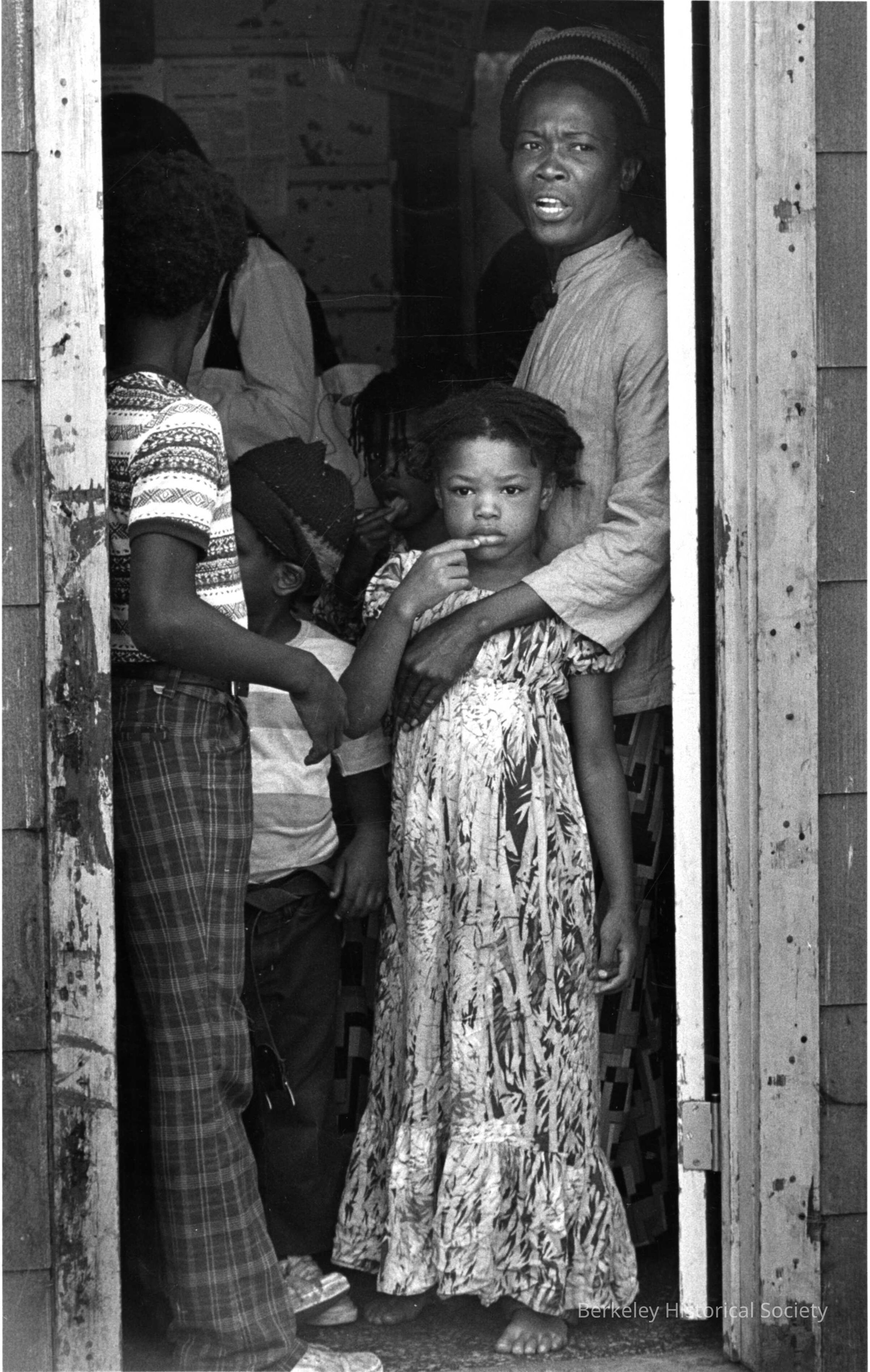 Berkeley Squatters eviction. Image shows an adult and three children staning in a doorway.