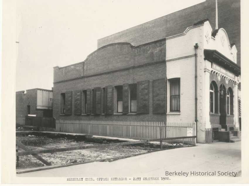 Berkeley Telephone - Commercial office, exterior Pacific Tel and Tel Company. 2277 Shattuck Avenue. 1890's building in back of 1900 building From: Telephone Museum