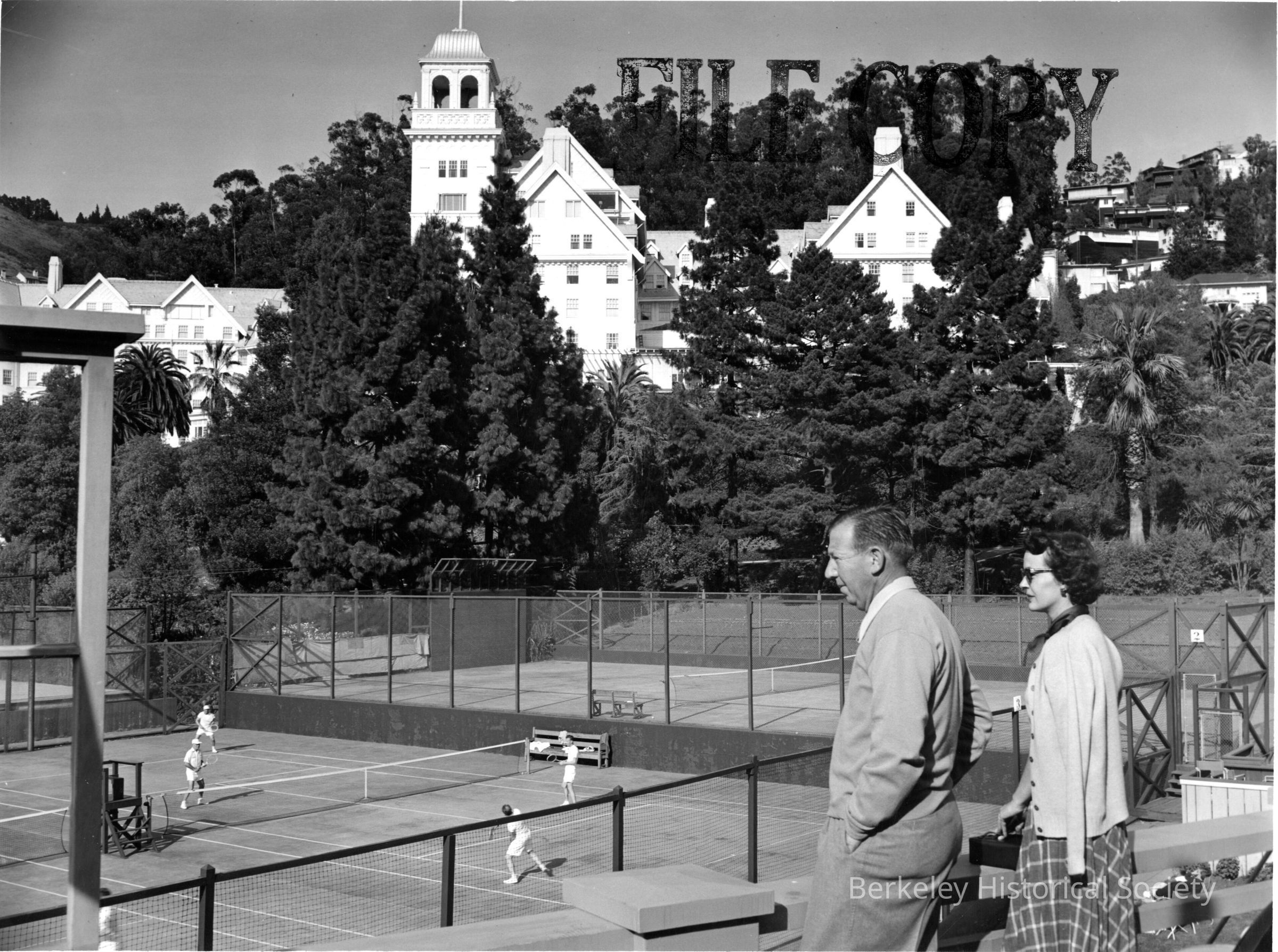 Tennis courts with Claremont Hotel in background; two people watching players, foreground right.