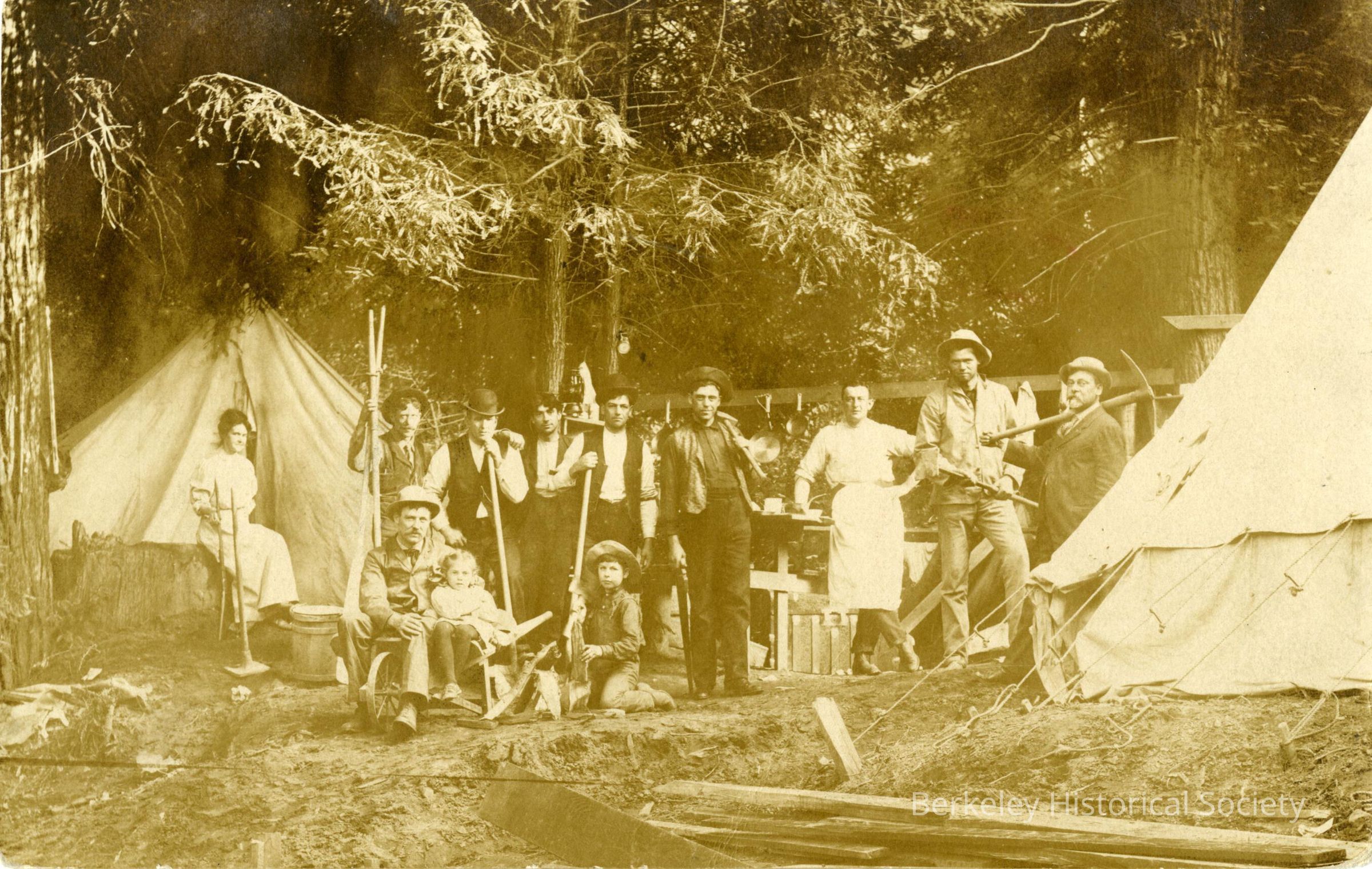 Divided postcard featuring sepia photograph of Berkeley Volunteer Fire Department members posing for a picture while building a cottage at Monte Rio. No message present.
