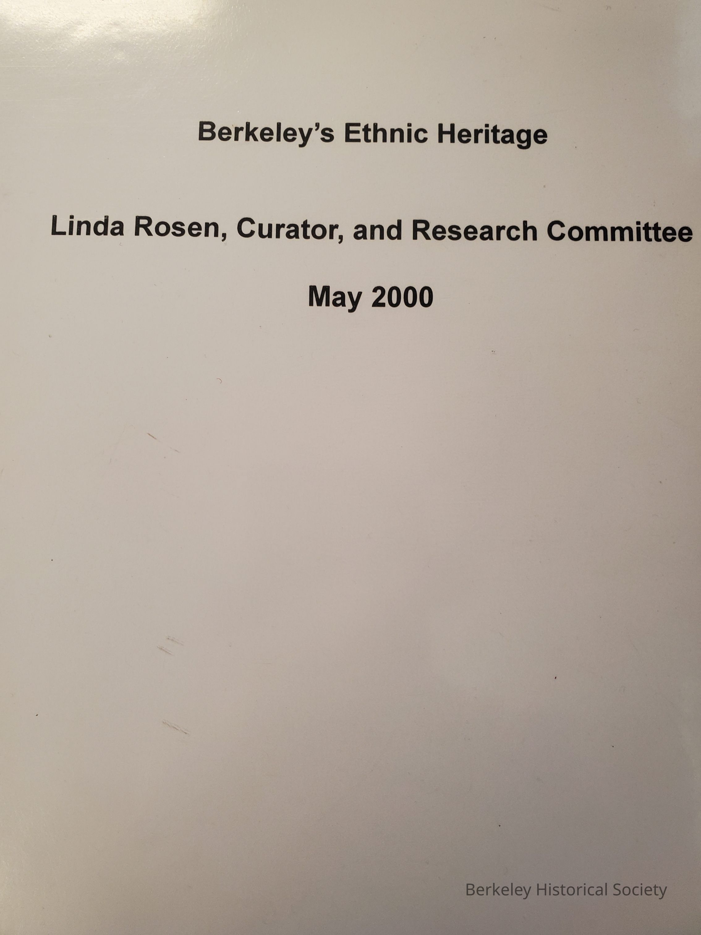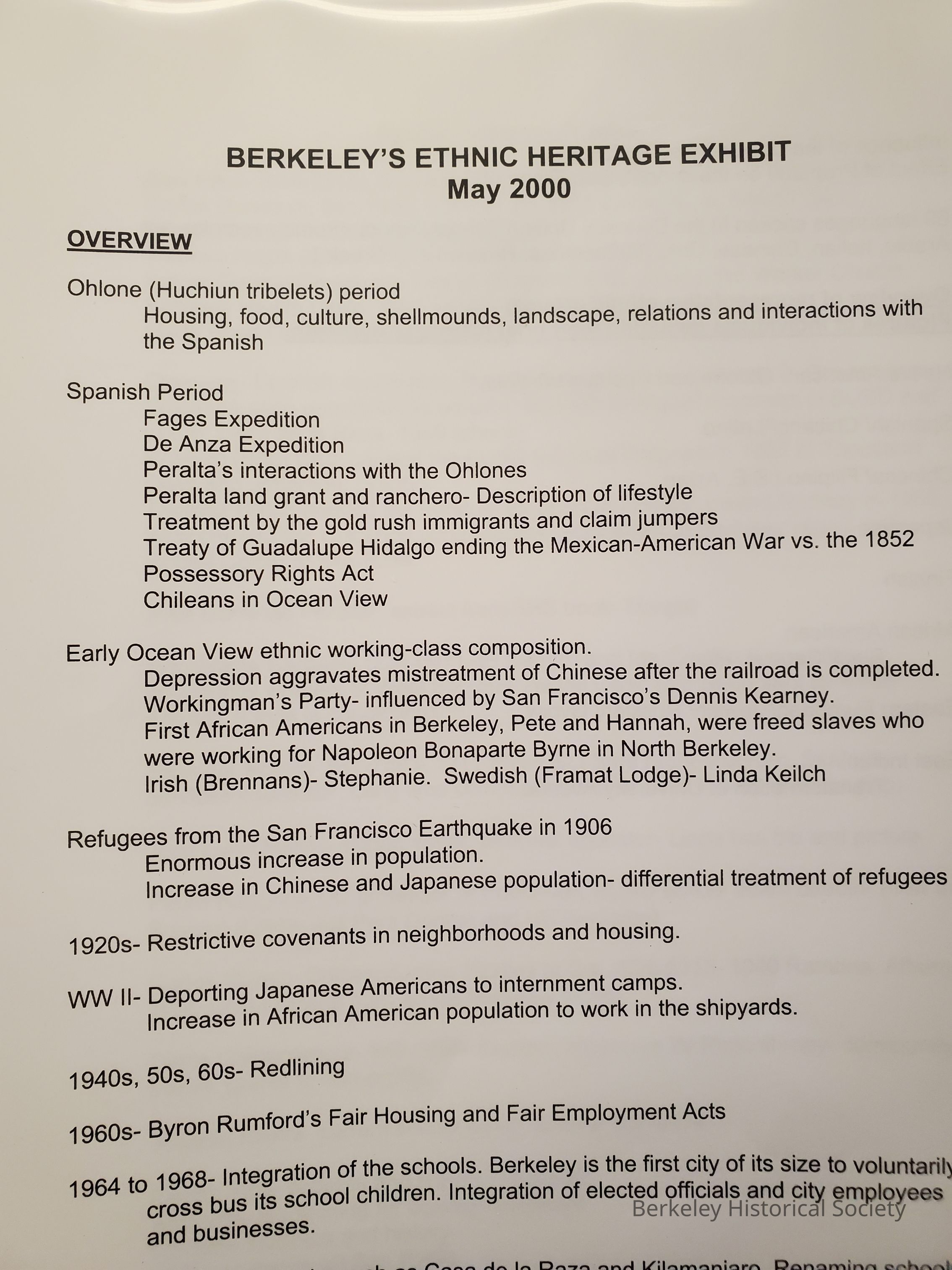Compilation of information gathered in preparation for an exhibit by the Berkeley Historical Society, May 2000, prepared by Linda Rosen and the research committee. Contains sections on Ohlone, Latinx, Chinese, South Asian, Japanese, African Americans, East European, Finns. Contains text and photographs.Other Names and Numbers