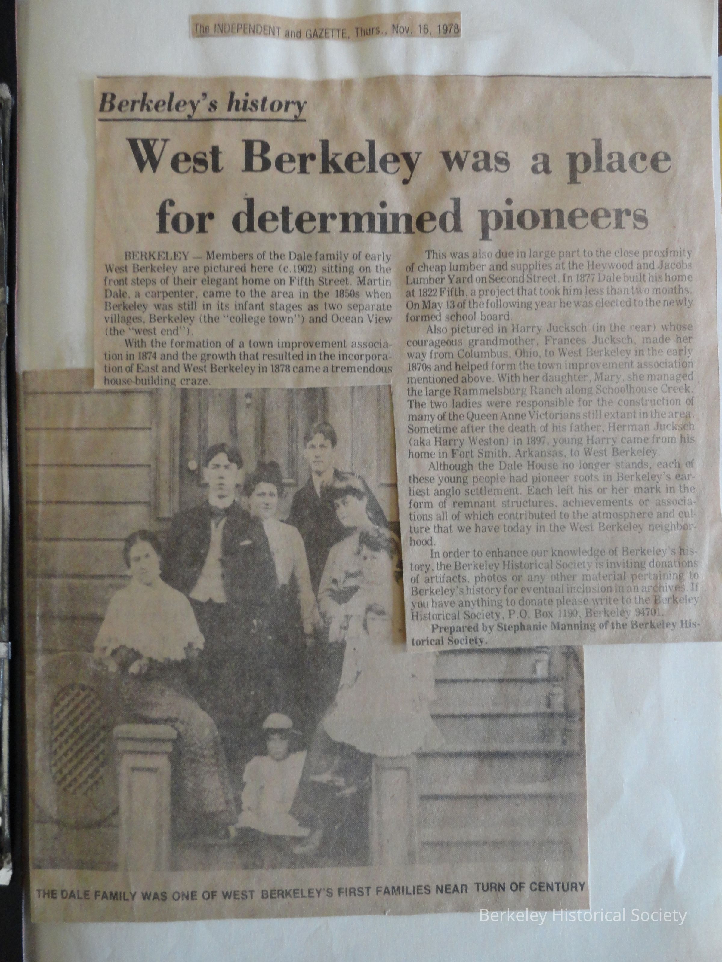 Box 1: Two binders of clippings from the Berkeley Independent and Gazette, Nov. 16, 1978–Dec. 21, 1980, on various aspects of Berkeley history. The articles were written by Stephanie Manning and other individuals on behalf of the Berkeley Historical Society. Many of them were published by BHS in 1983 in the book Exactly Opposite the Golden Gate: Essays on Berkeley's History, 1845-1945.