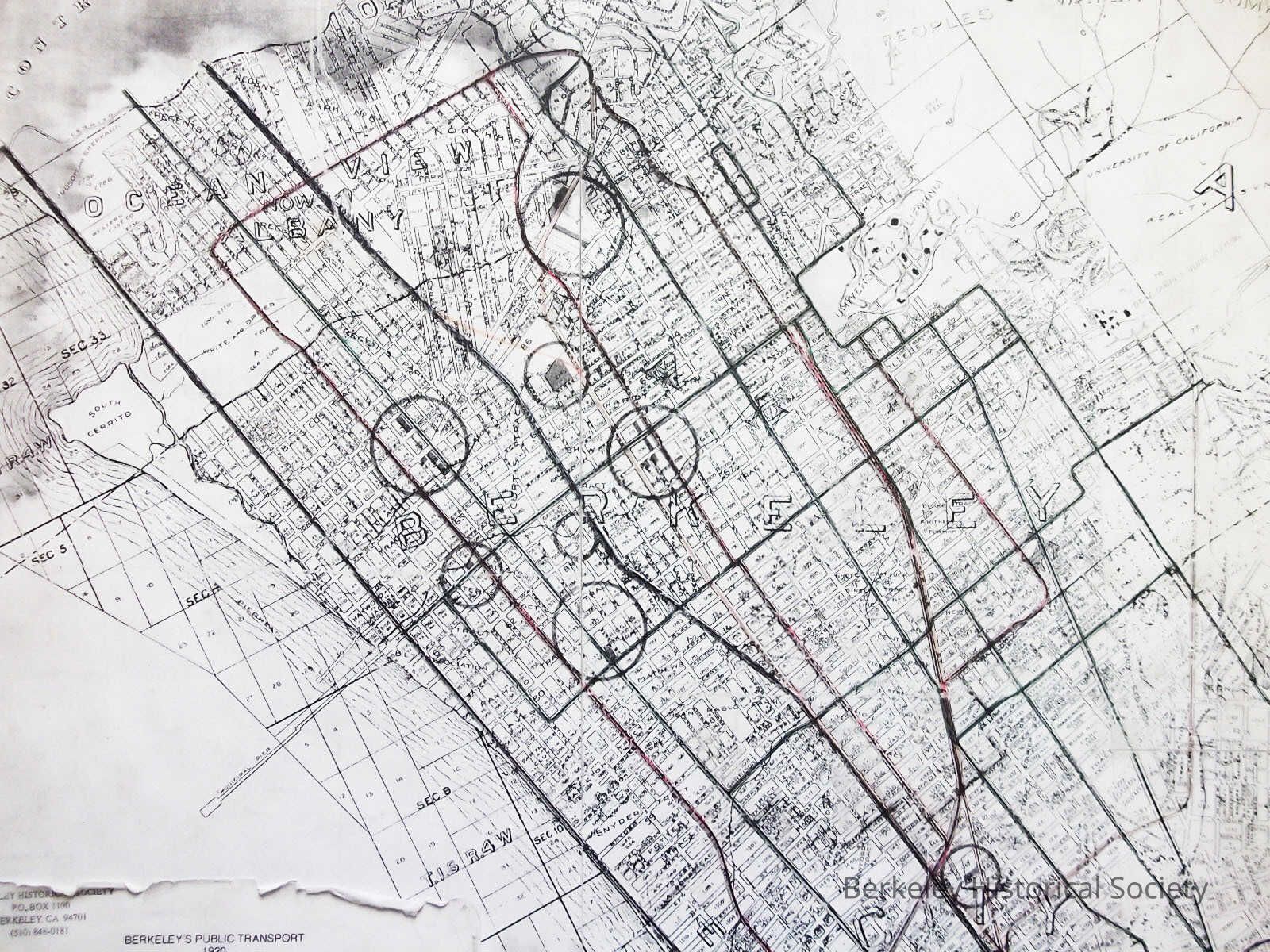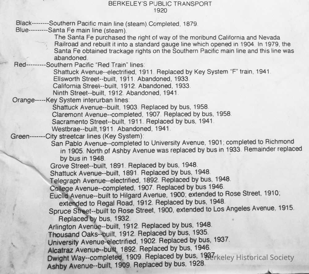 A map of Berkeley with transit lines as of 1920. A description of the carriers and lines in left bottom corner.