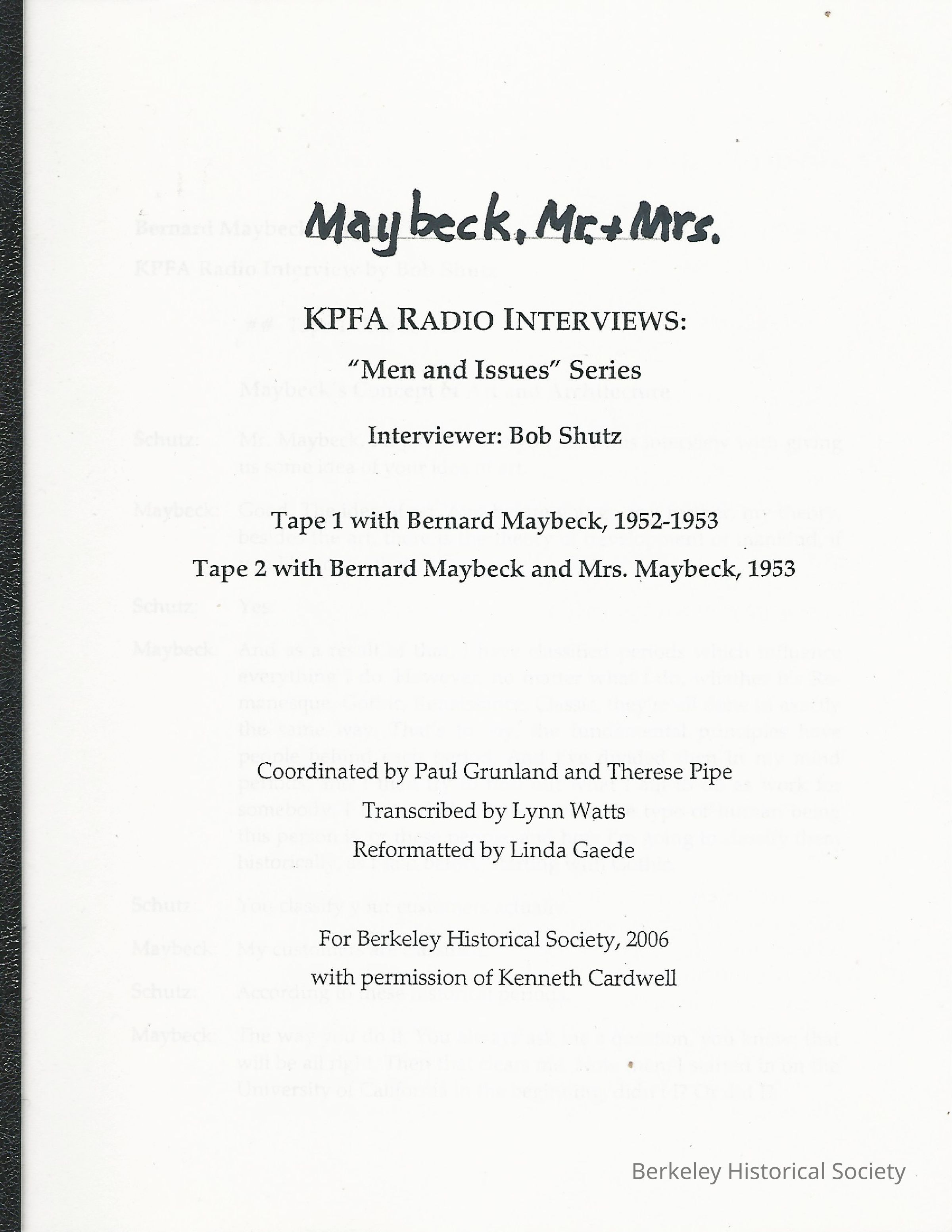 Interviews conducted by Bob Shutz, 1952-53 with Bernard and Mrs. Maybeck.