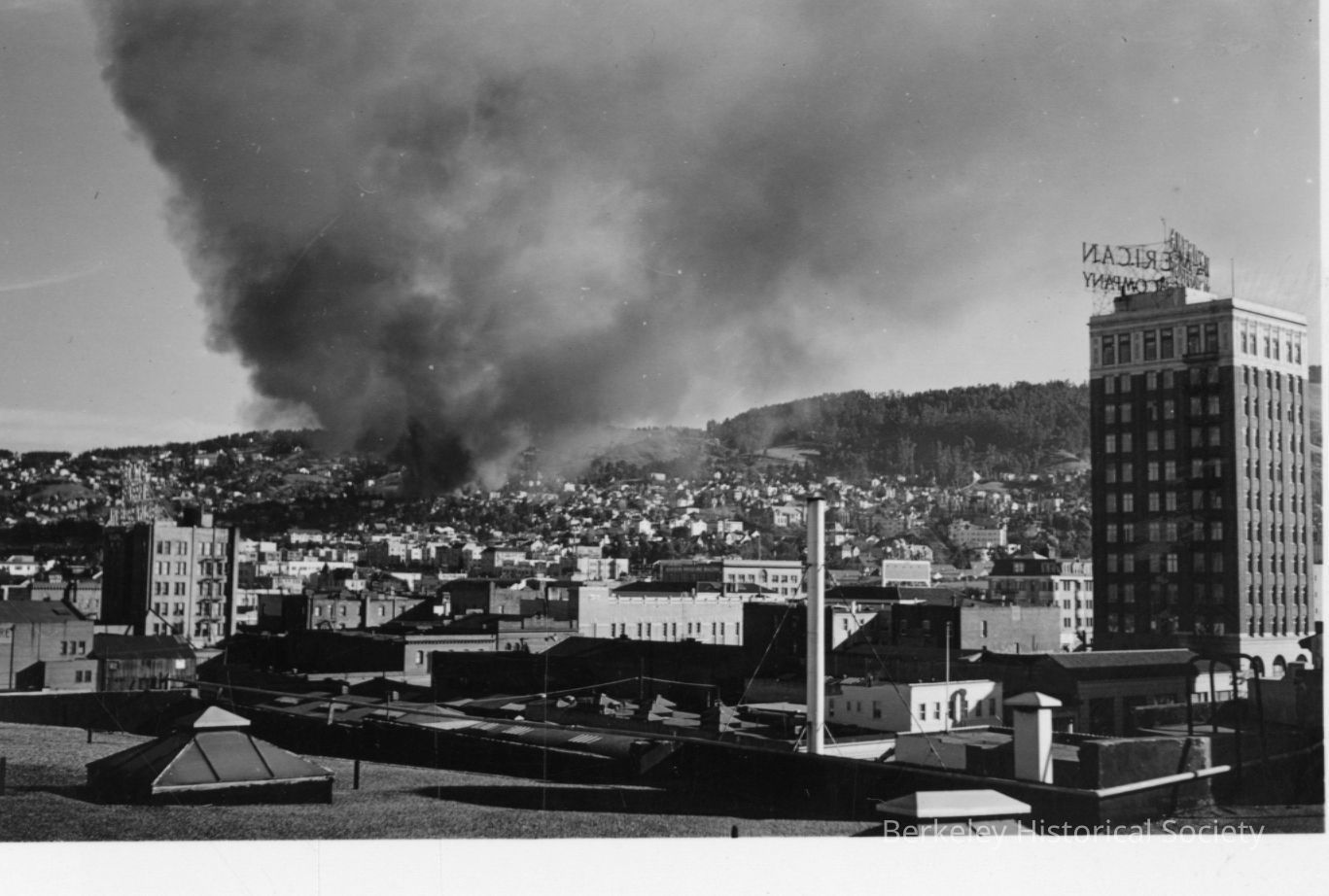 Smoke rising from fire, seen from downtown.