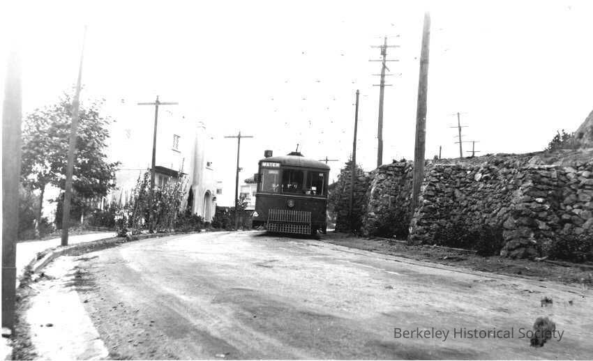 Key Systyem 900, 1927. Euclid between Bred Harte Path and Crystal Way. Stone retaining wall between upper and lower sides of road undulates around telephone poles.