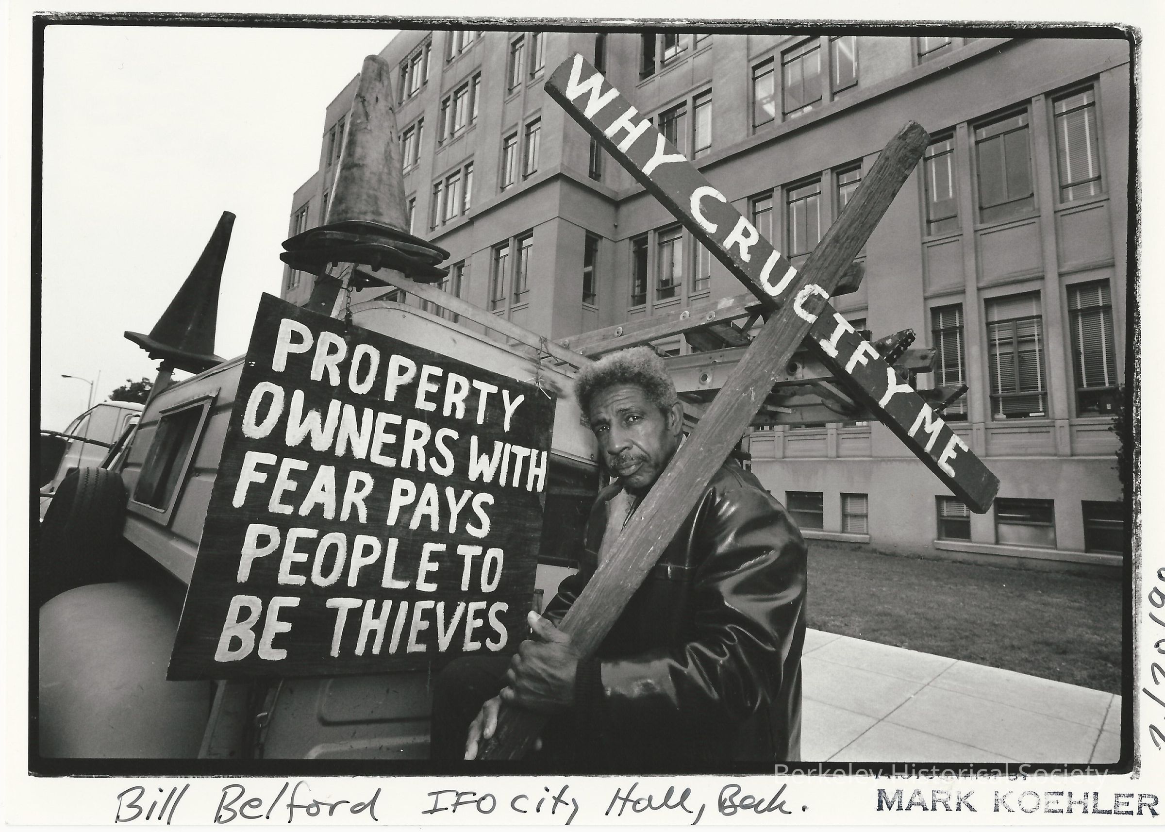 Signs: on truck "Property owners with fear pays people to be thieves." He is holding sign in form of cross, "Why crucify me." 2/20/1990.