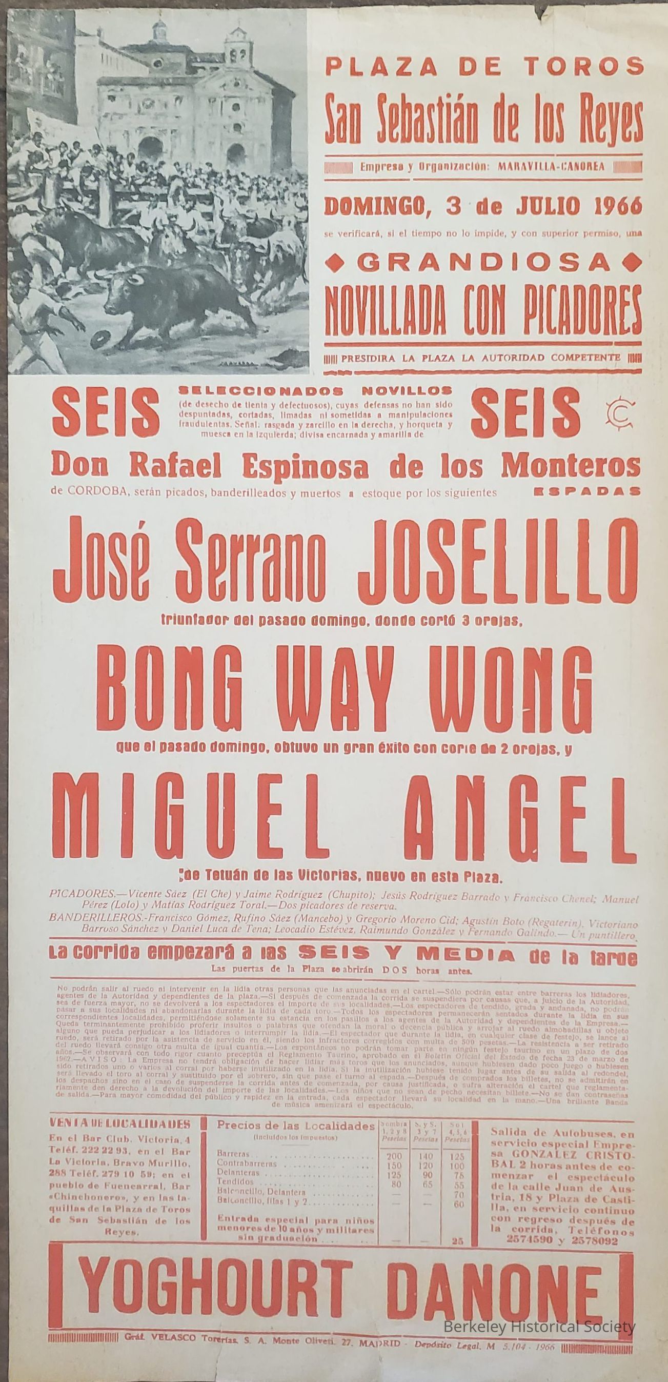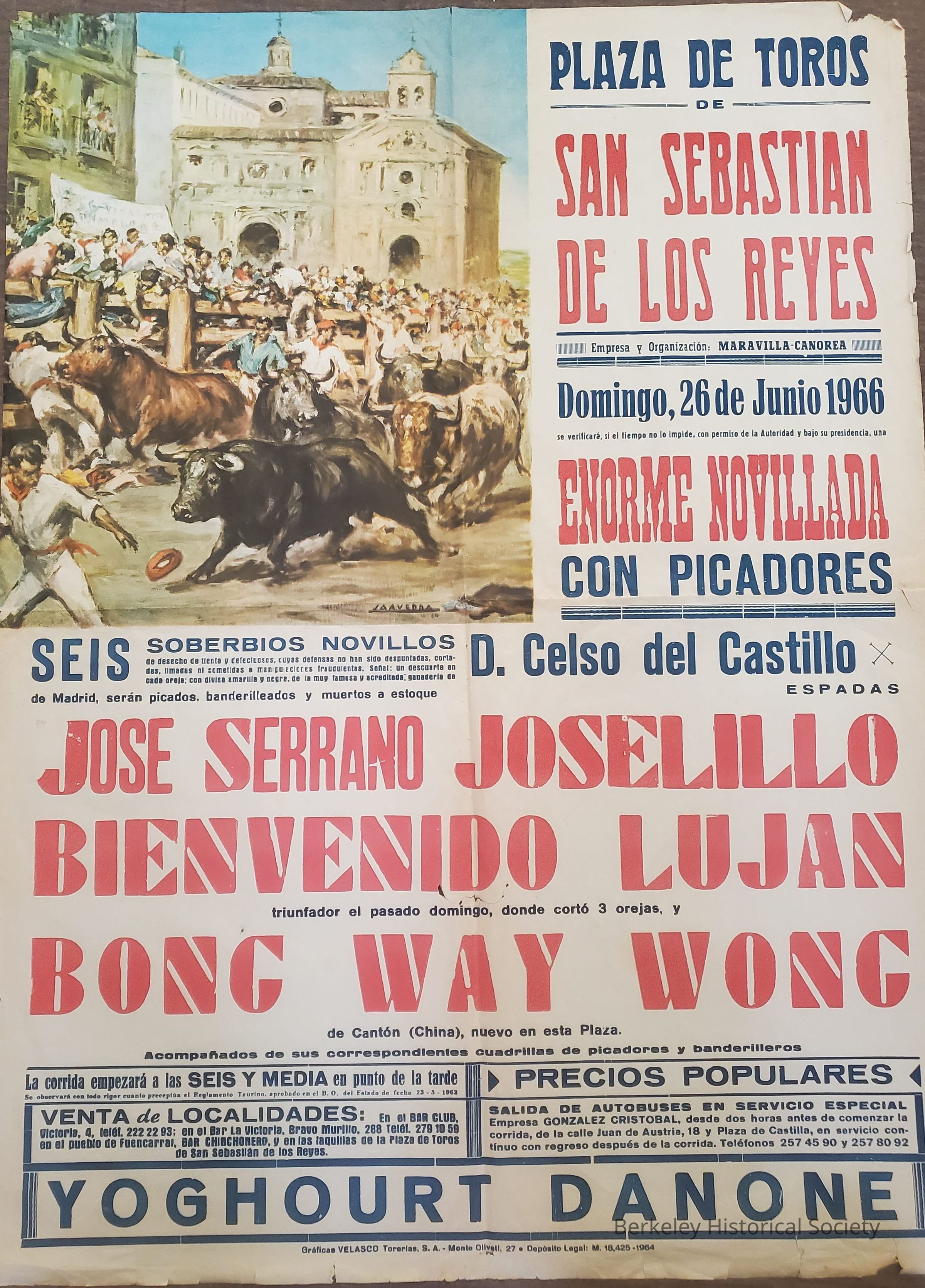 Two posters for July 26, 1966 bullfight featuring Billy Wong (Bong Way Wong) of Berkeley, Plaza de Toros, San Sebastian de los Reyes, Spain. Wong became known as El Chino.Lexicon