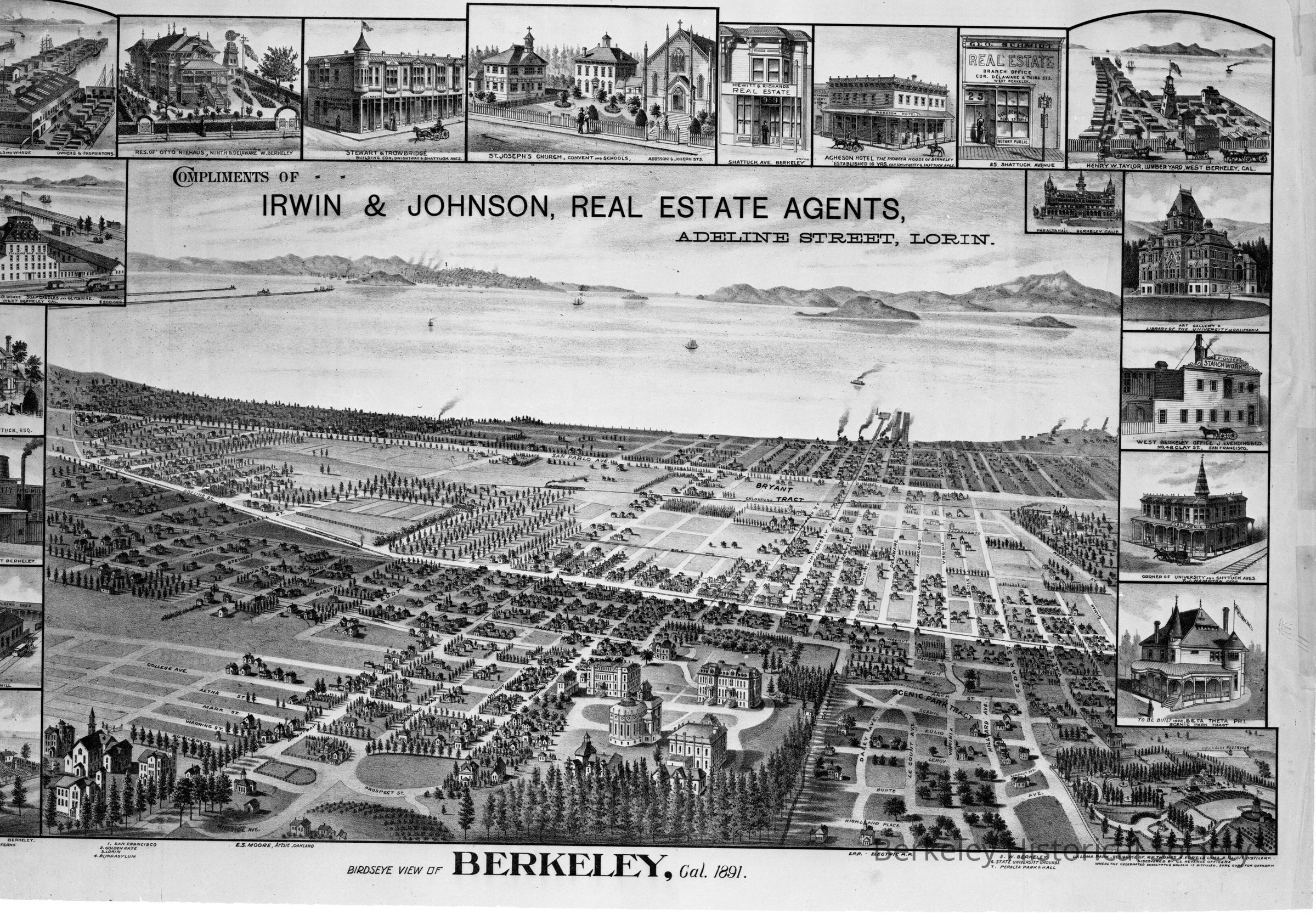 Birdseye view of Berkeley from hills - Irwin & Johnson Real Estate Agents - transparency of lithographOther Names and Numbers