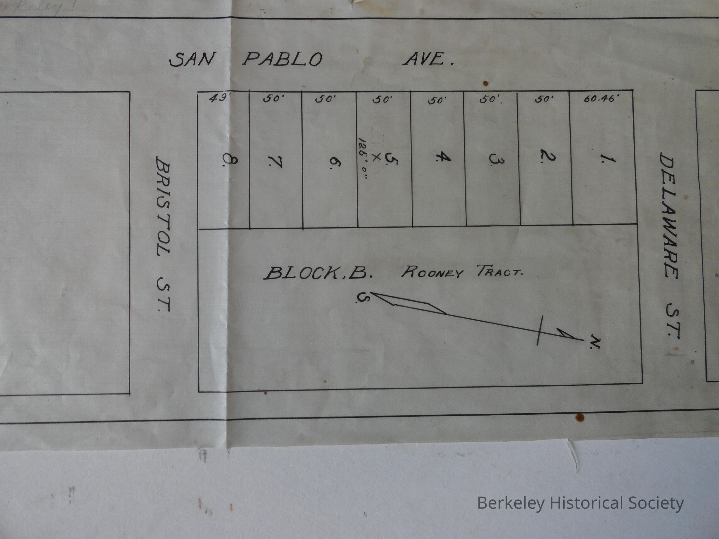 Title supplied from portion of map. Date in pencil Shows tract along San Pablo Avenue, between Briston St. (now Hearst) and Delaware Street. Ink on linen.