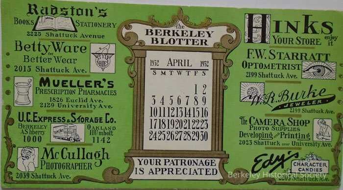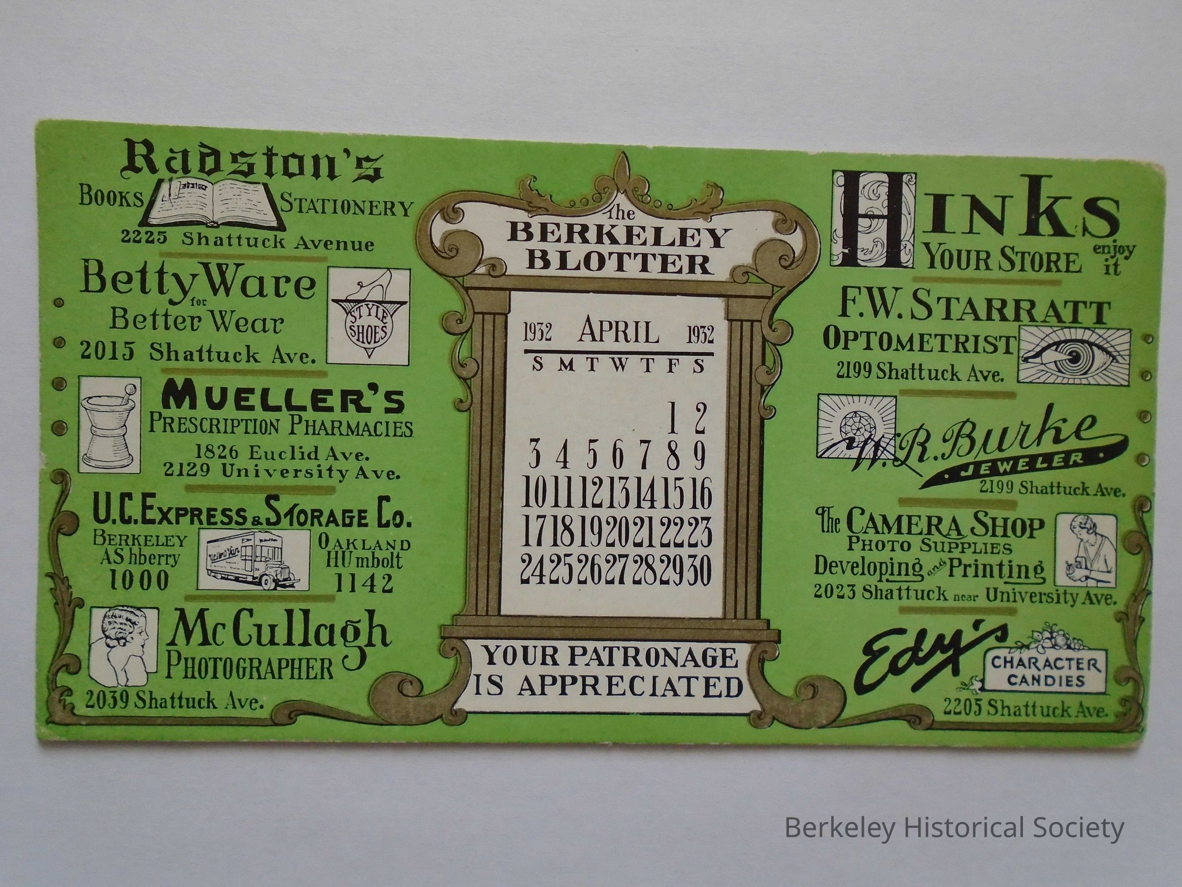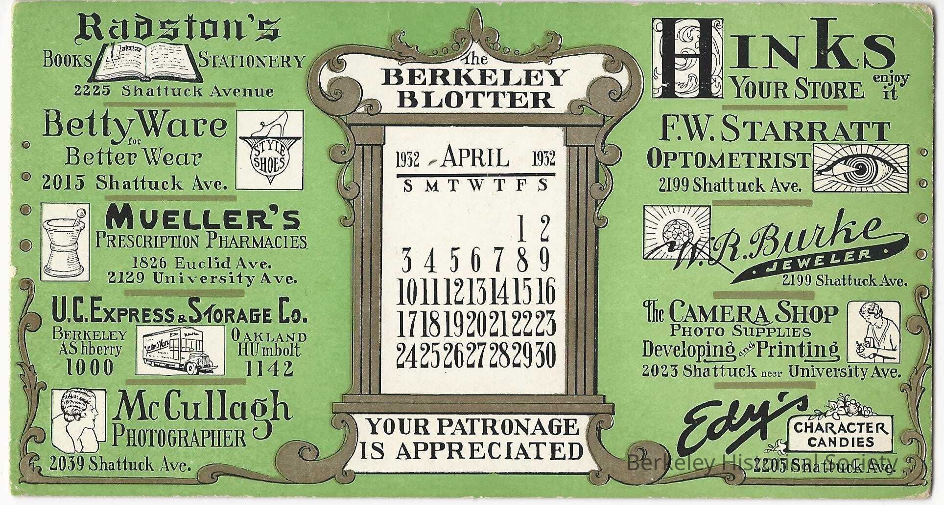 Green paper blotter with ads for Berkeley businesses and an April 1932 calendar. (Hink's, Edy's. Radston's etc.)