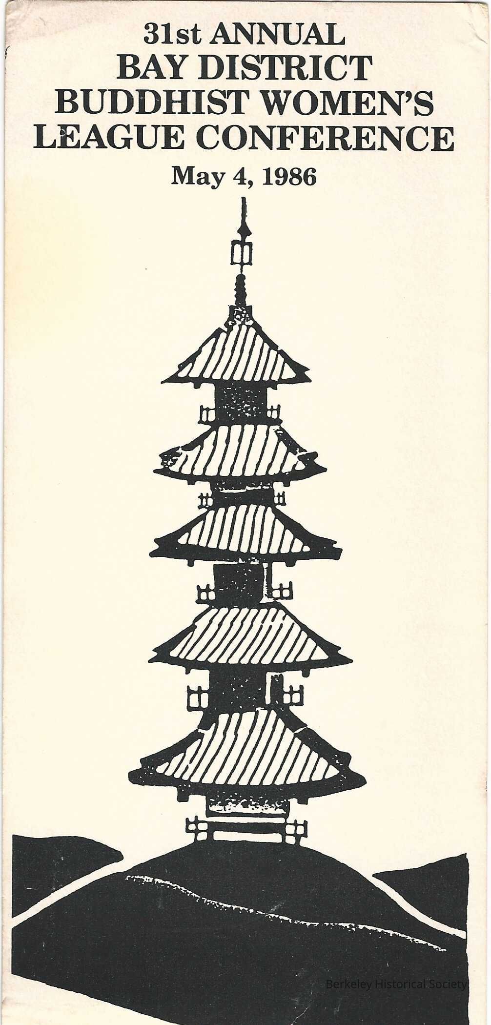 Paper bookmark advertising 31st Annual Bay District Buddhist Women's League Conference, May 4, 1986. Hosted by Berkeley Buddhist Women's Association. Picture of a pagoda in middle.