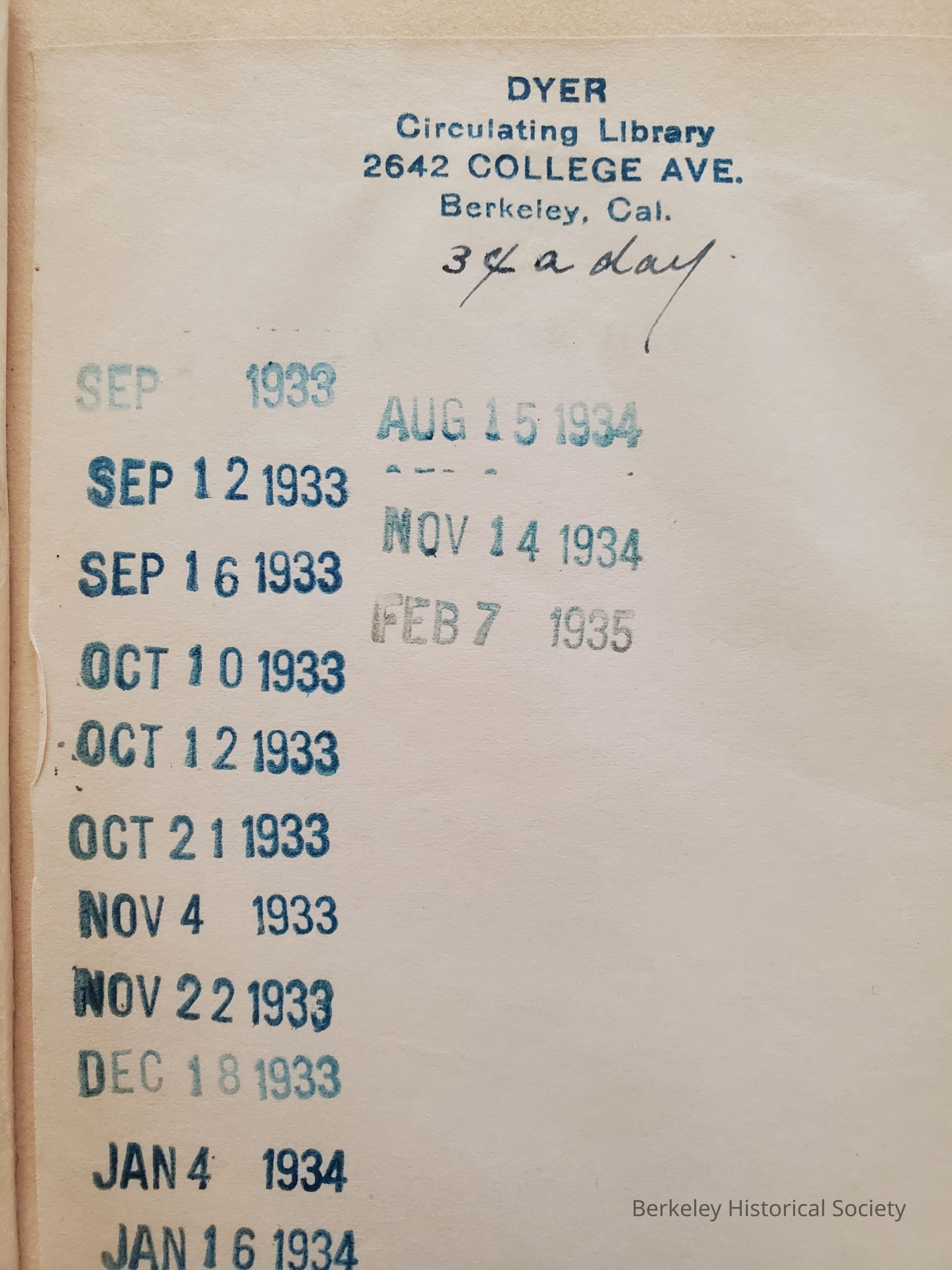 Two books which had been held by private Berkeley lending libraries: Murder will out, by George E. Minot (Boston; Marshall, Jones Co., 1928) from the Chimes Pharmacy Circulating Library (3206 College Ave); and Wonder Hero, by J. B. Priestley (New York; Harper & Brothrs, 1933) from the Dyer Circulating Library (2642 College Ave)Lexicon