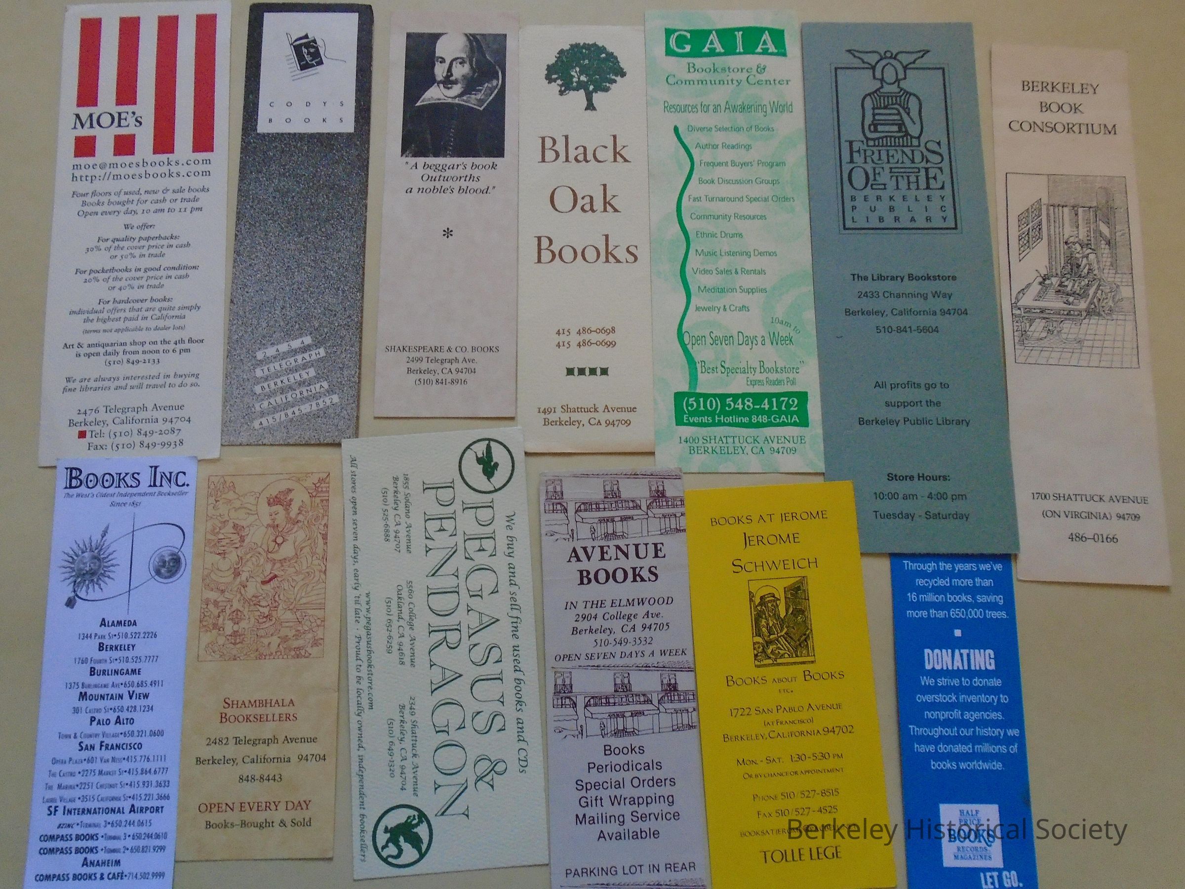 3. Paper bookmark from Cody's Books, 2454 Telegraph, Berkeley, CA, 415-845-7852. White and black with Cody's "logo" at top (person reading a book). After opening an additional store in San Francisco and relocating several times in Berkeley (to 4th Street and then Shattuck Ave), Cody's closed permanently in 2008. The Telegraph store, the most well known and an "institution" in Berkeley, closed in July 2006. (2003.068.004)