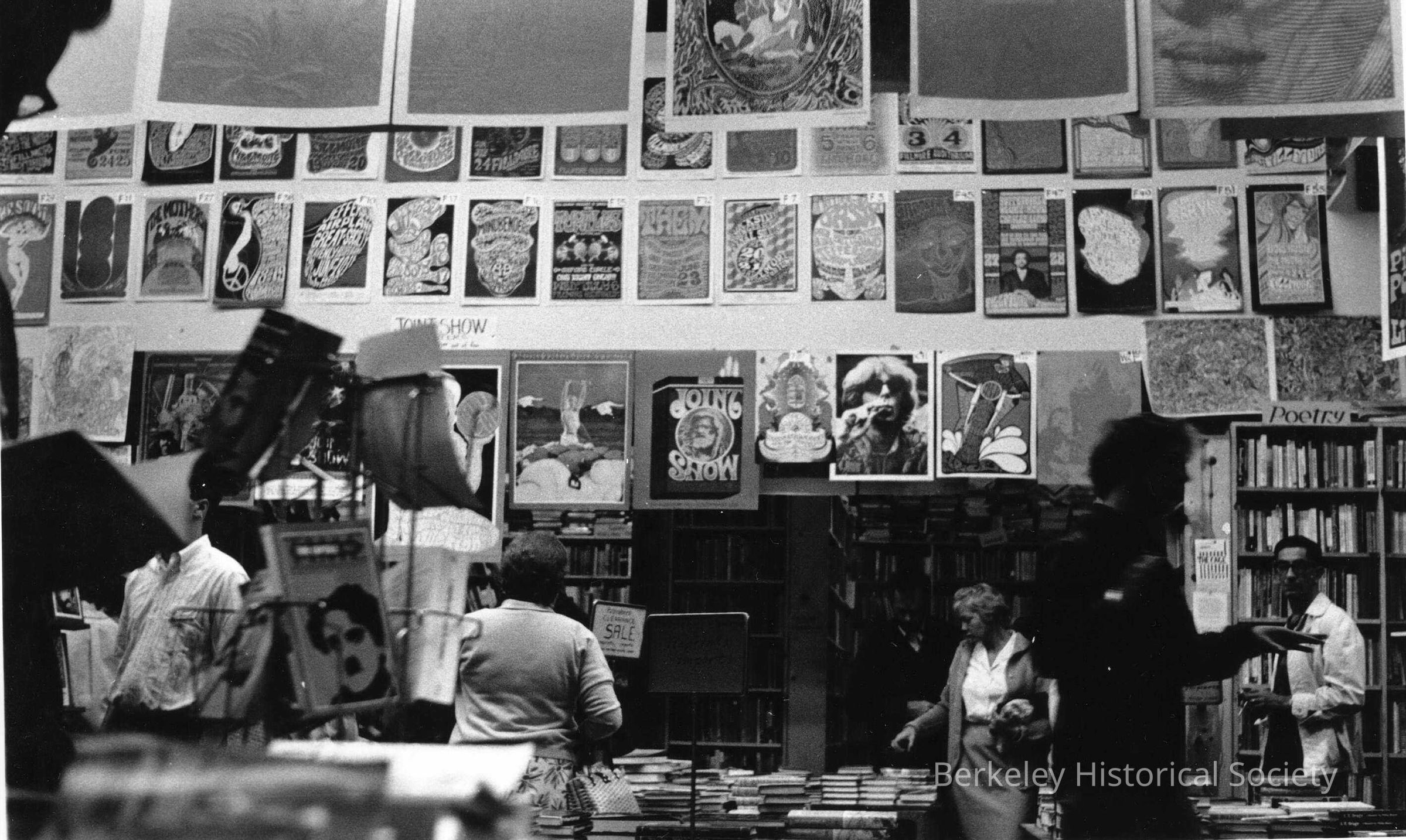 South Campus. 2499 Telegraph Avenue. Interior of bookstore, posters RESTRICTED USE ©Harold Adler