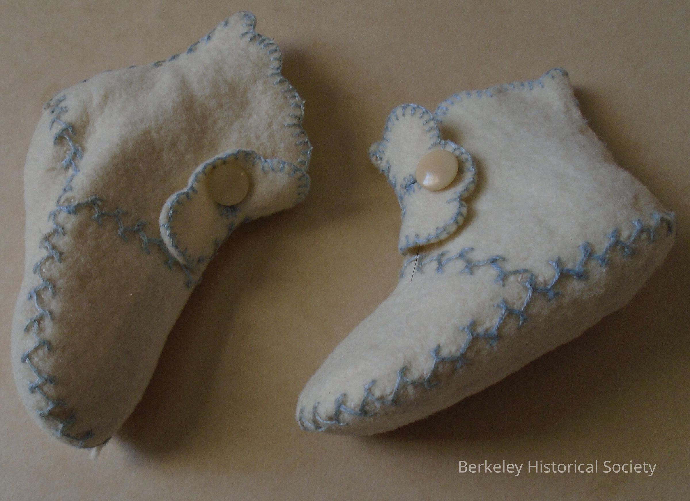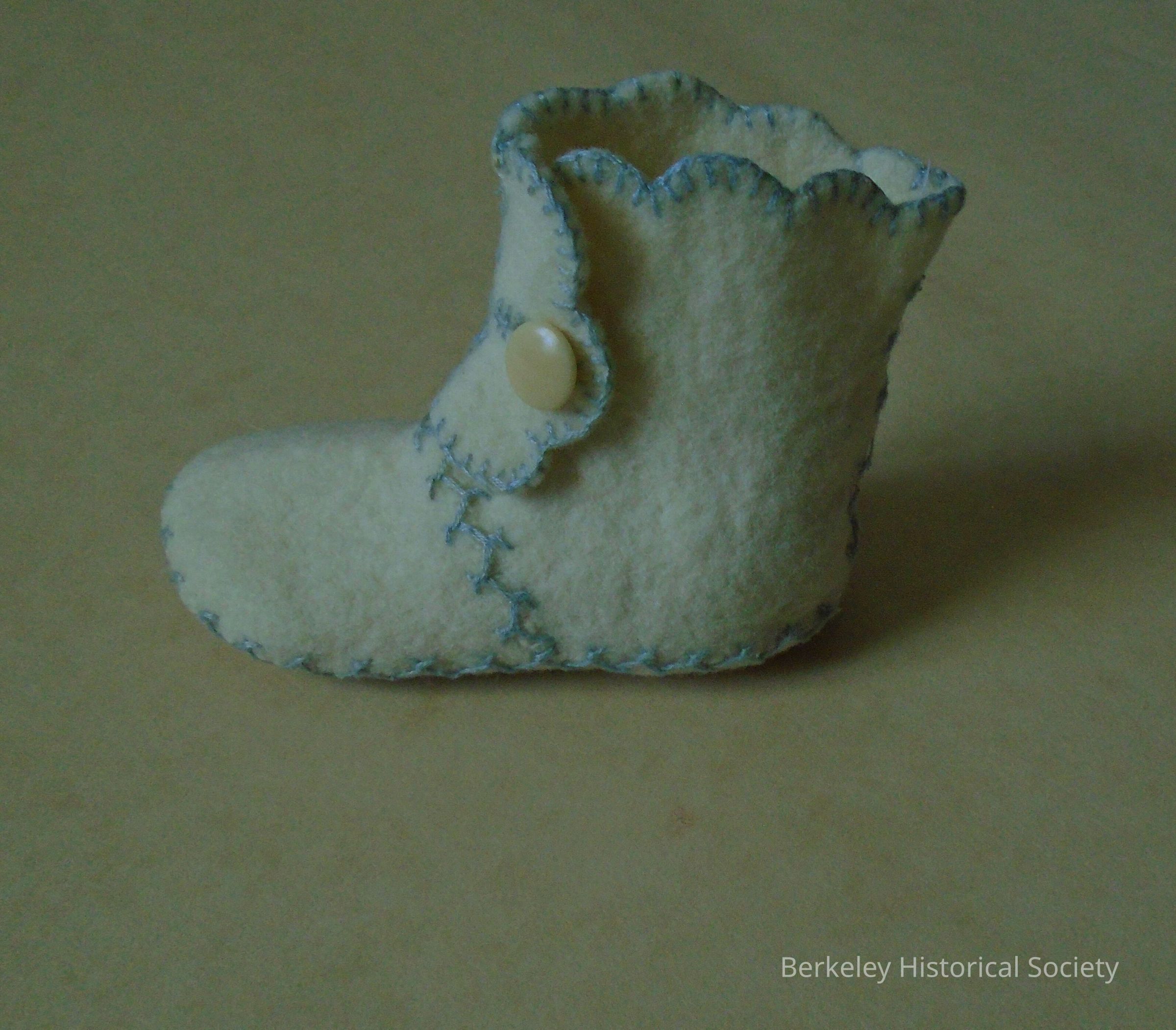 White, wool felt, handmade baby bootees with blue embroidery trim and button closing. See family info on 1978.002.265