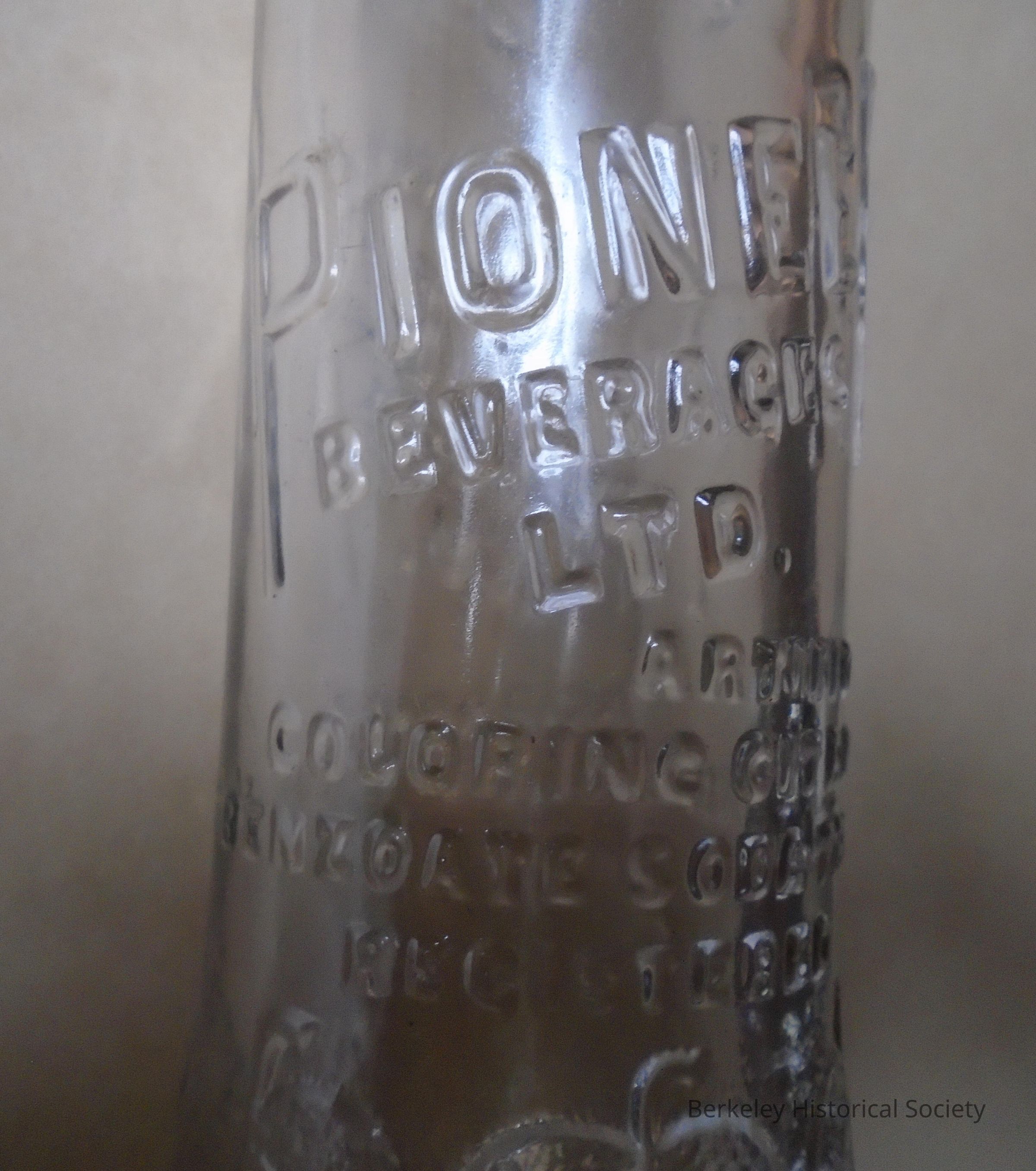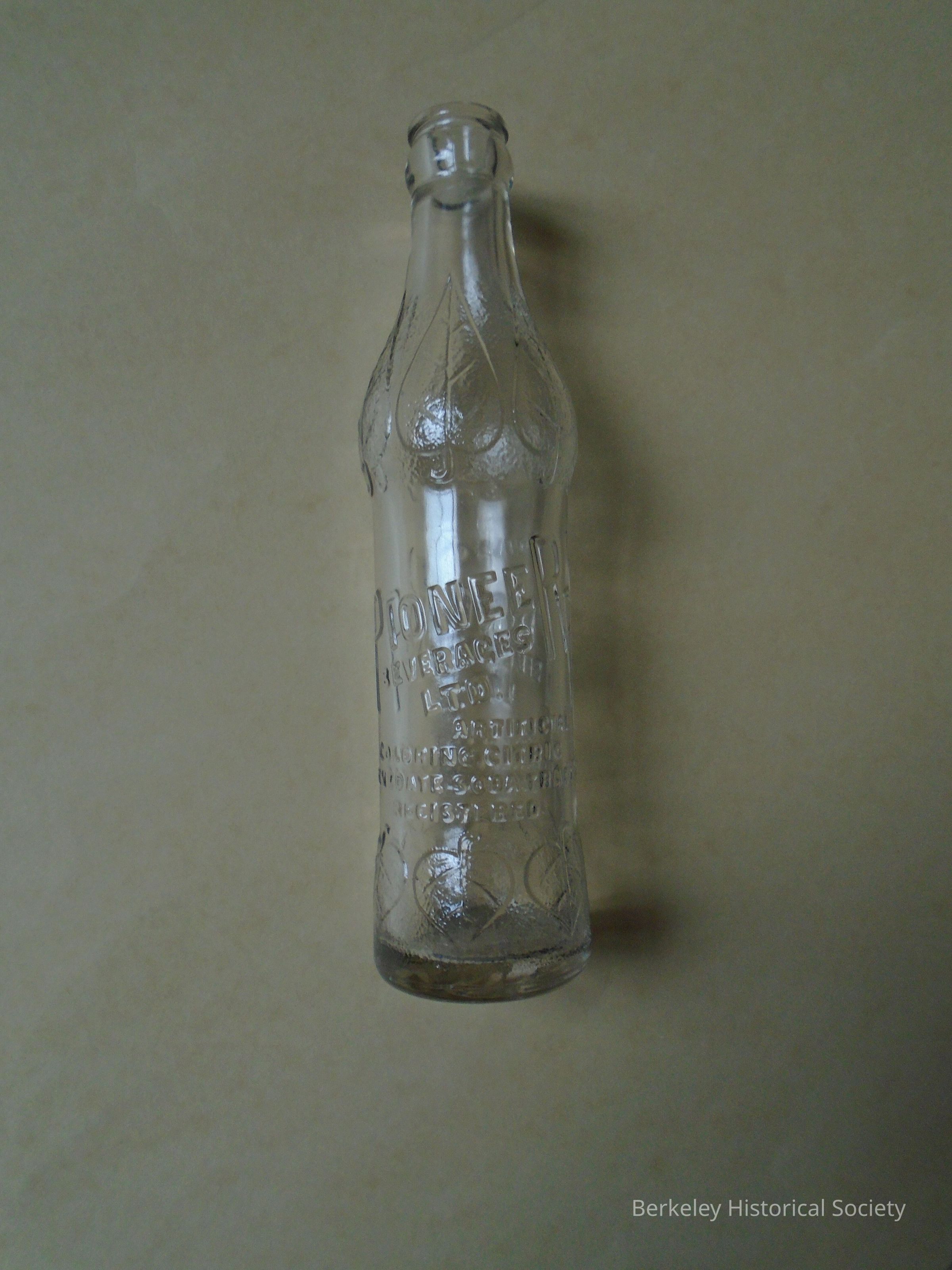 Glass bottle: Pioneer Beverages Ltd. Fruit Flavors Acid Added net contents 6 1/2 flu oz artificial coloring. Narrow bottle with bulge towards top and leaves embossed on it. On bottom: OAK. No cap.