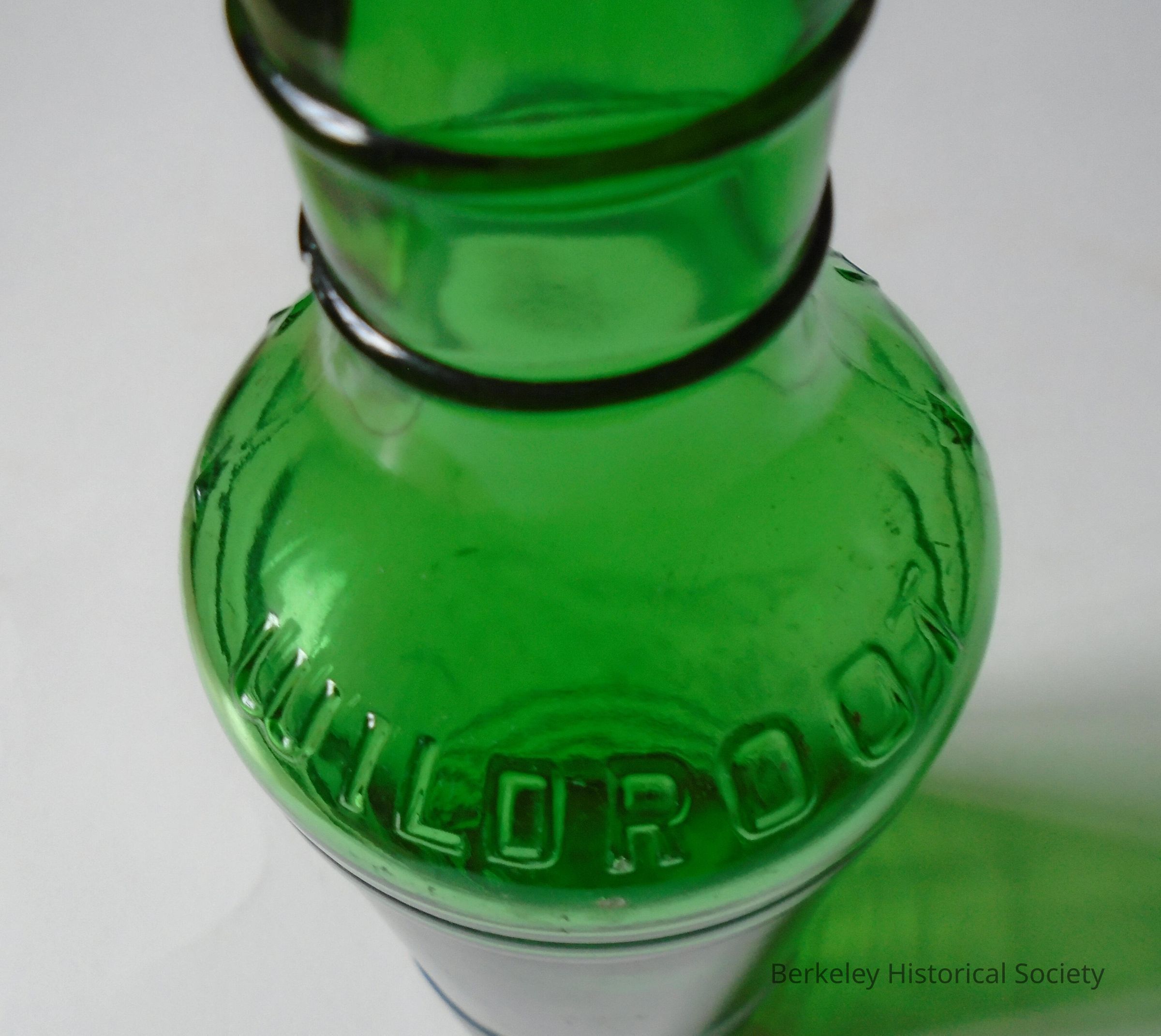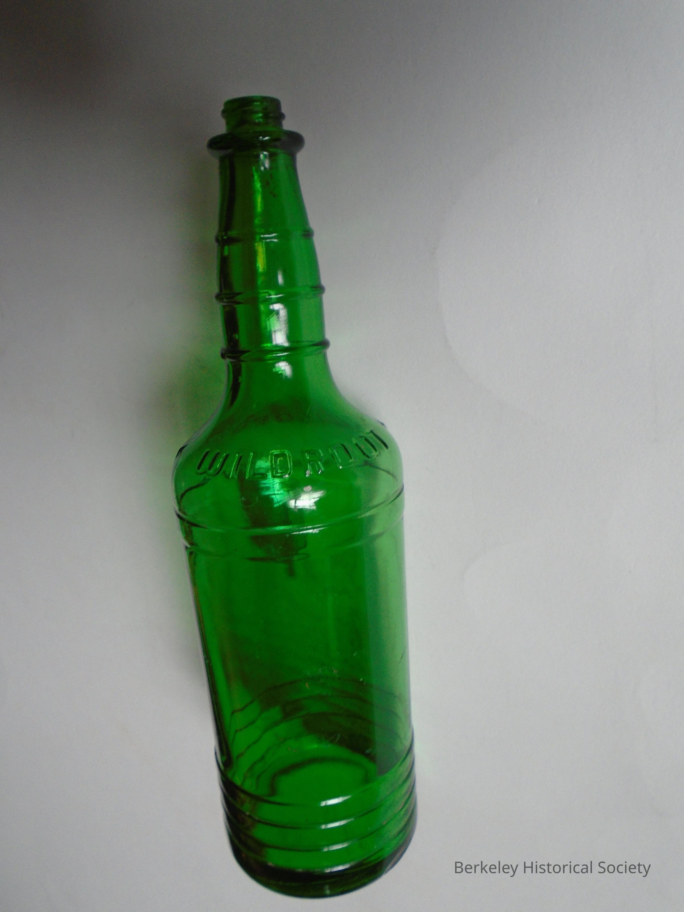 Green, glass bottle for hair oil, with embossed text: " * WILDROOT * WILDROOT" around top of neck. No top. Dug up in backyard @ 1629 Parker St., Berkeley.