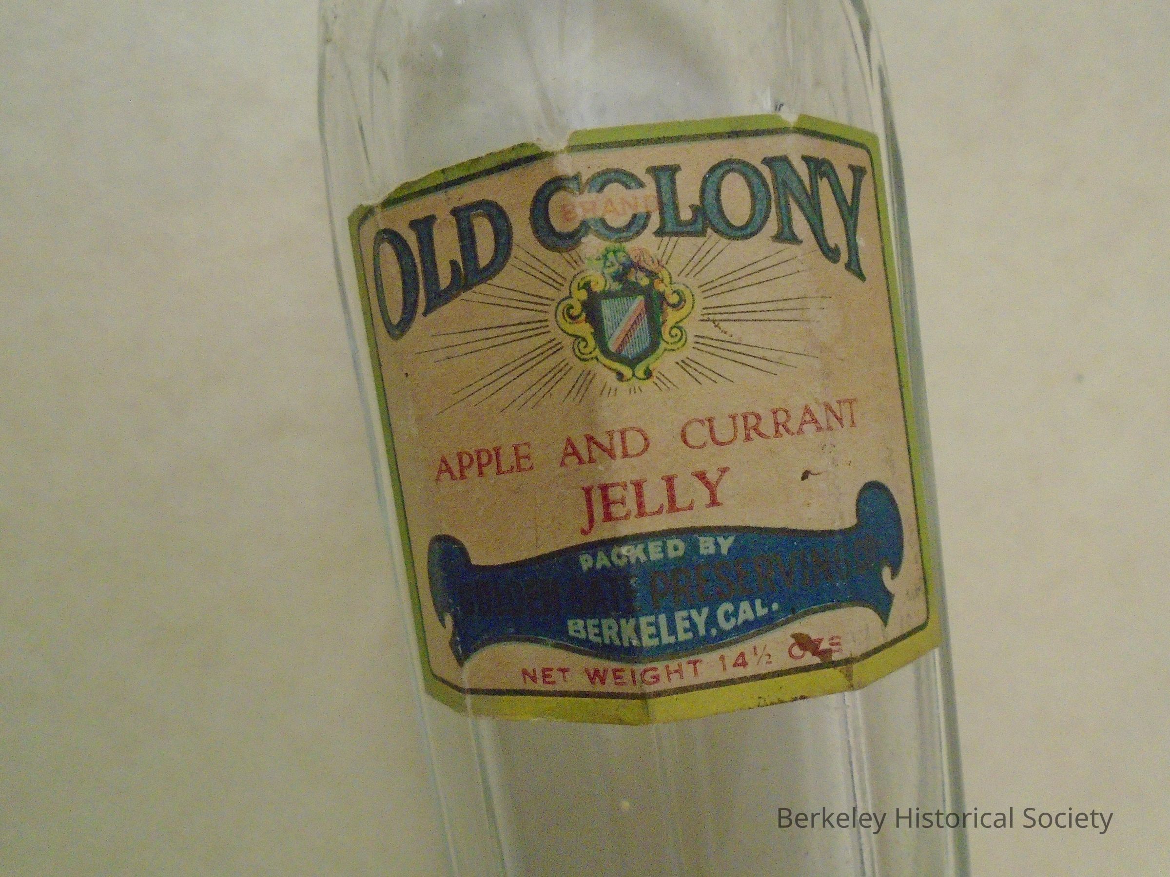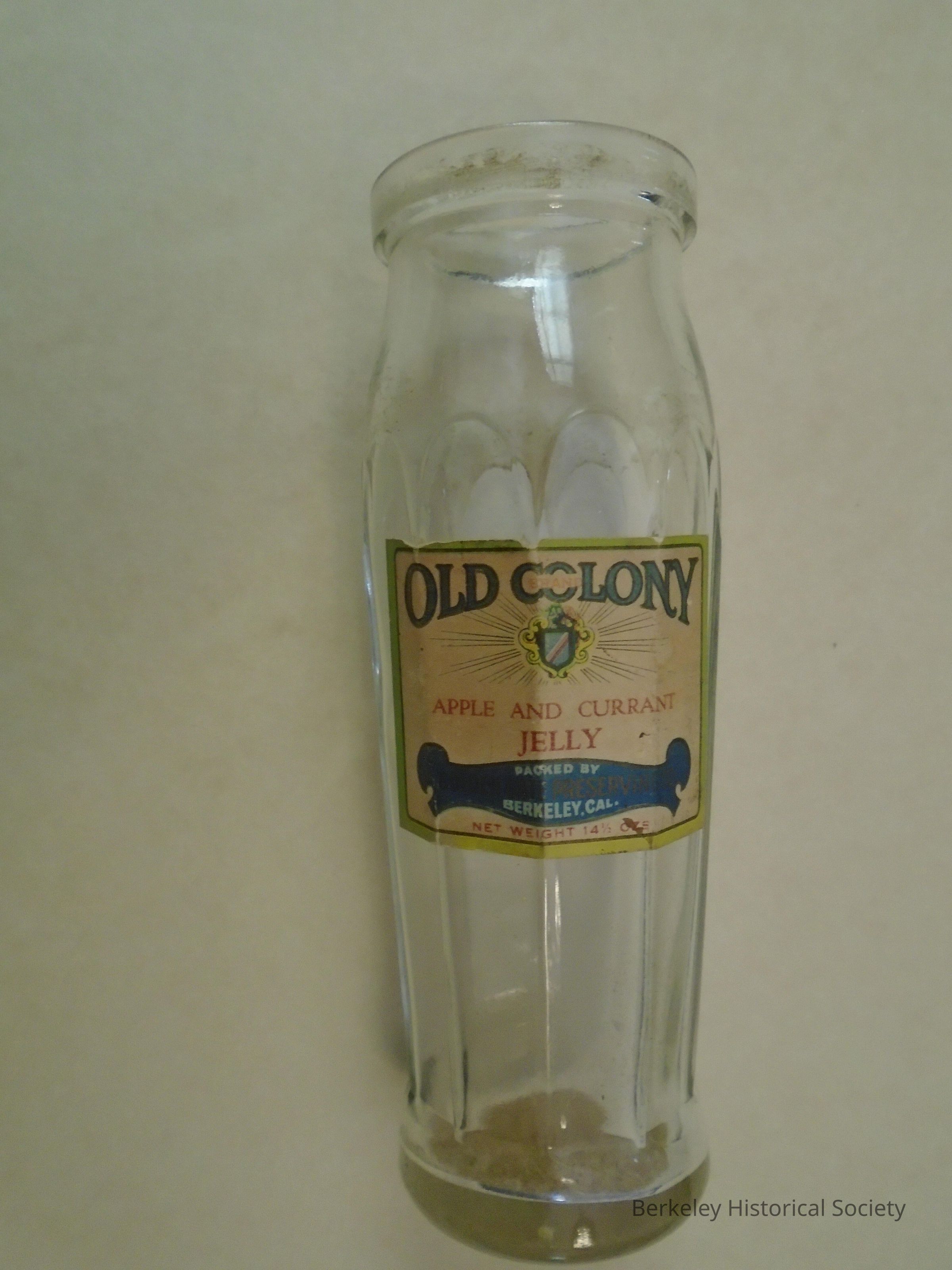 Glass jar for Old Colony Apple and Current Jelly, Packed by Golden Gate Preserves Co. , Berkeley, CAL. Net weight 14 1/2 ozs. Tall, faceted jar with wide mouth, green and red printing on paper label.Made/Created