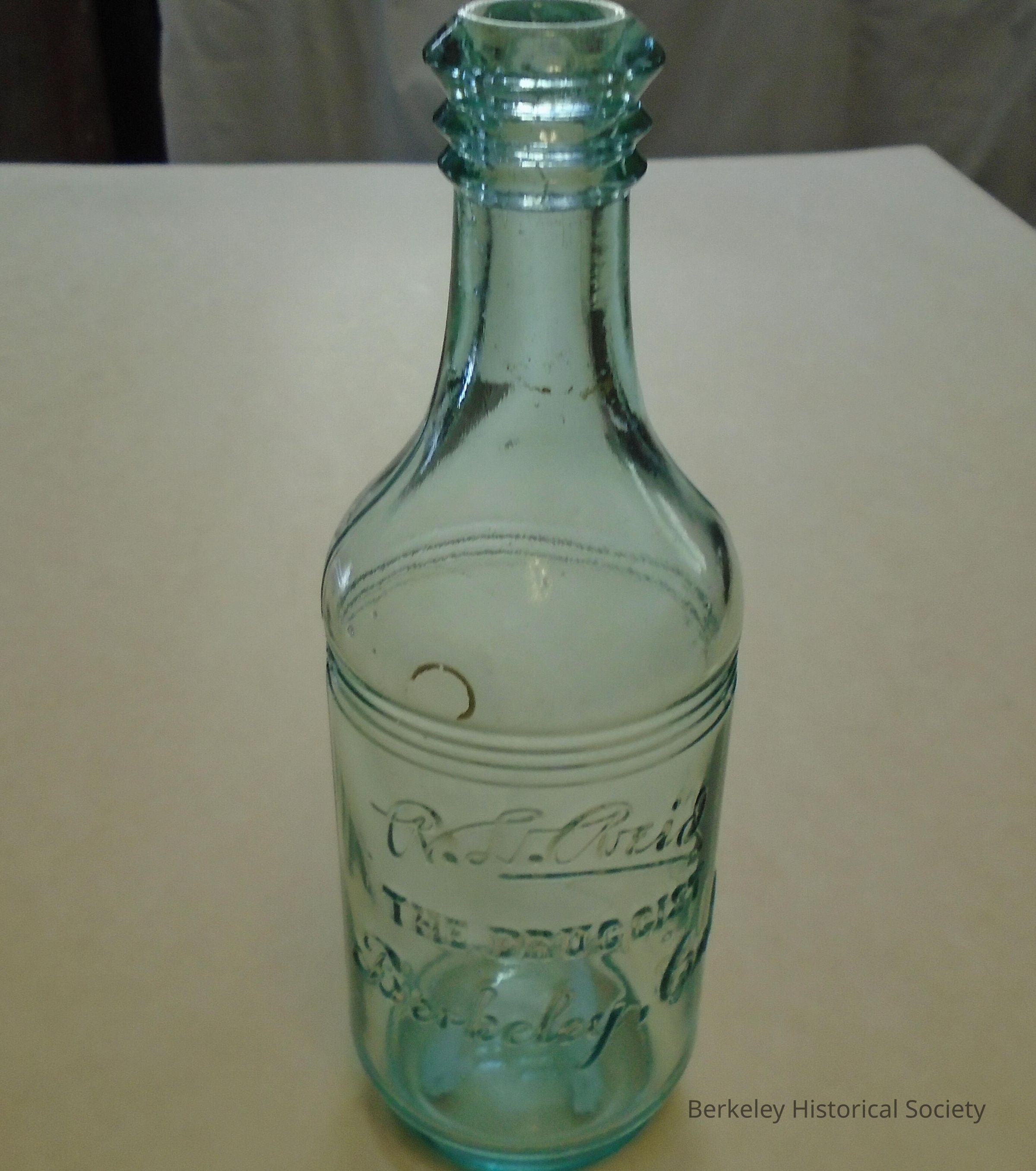 Green tinted, glass bottle, probably soda bottle with : "R.L.Reid The Druggest Berkeley, Cal." embossed on it. On the bottom: 100 H.