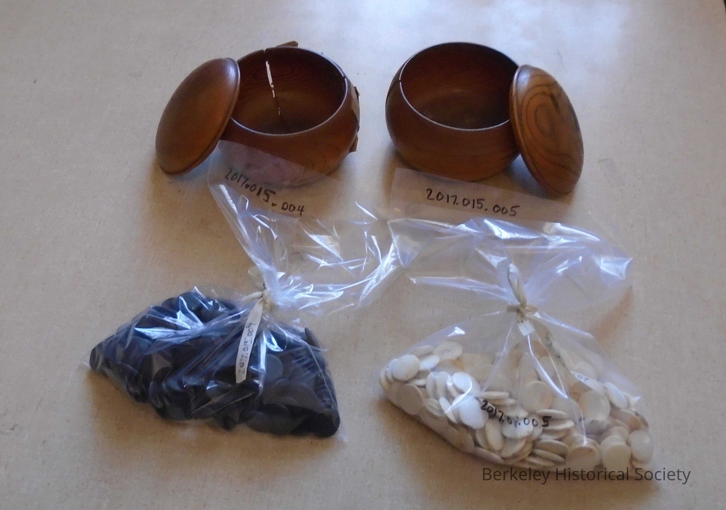 Round wood bowl with lid used to hold Go playing pieces (discs, stone). The bowl was used in a Japanese internment camp during WWII and later after the war by evacuees who temporarily stayed at a house at 1813 University Ave. in Berkeley. See also 2017.015.001-2017.015.005 for board and pieces/discs.