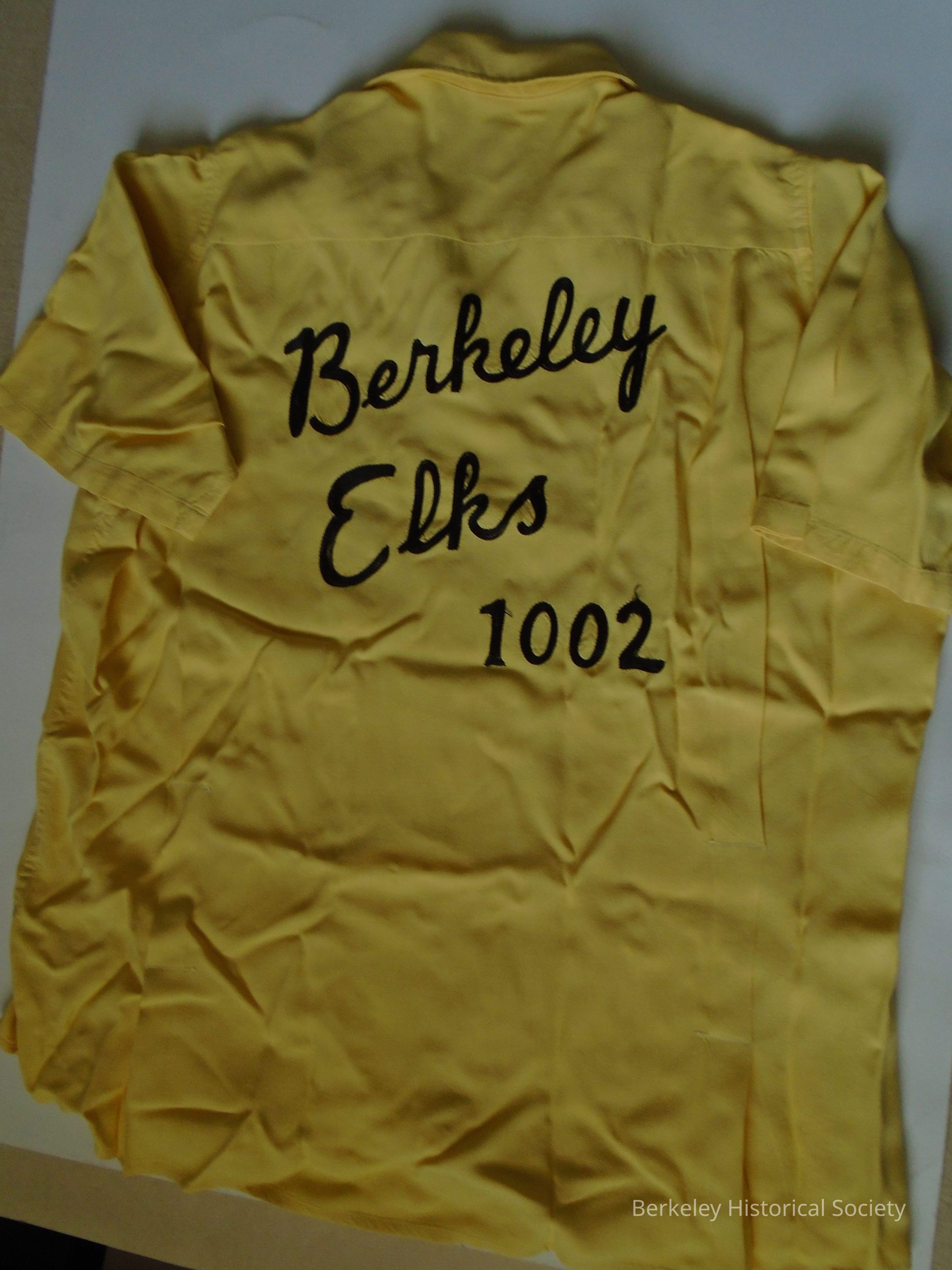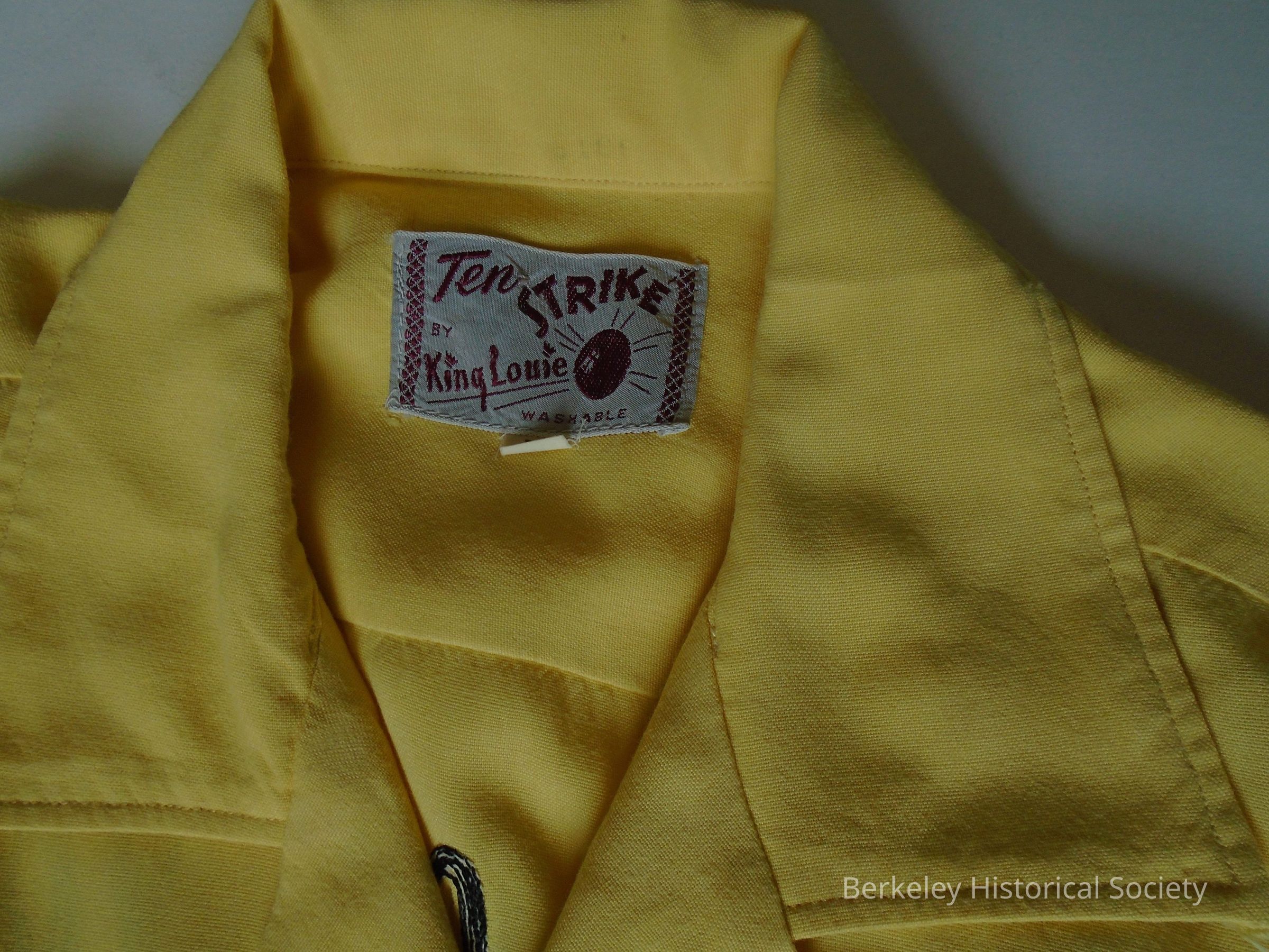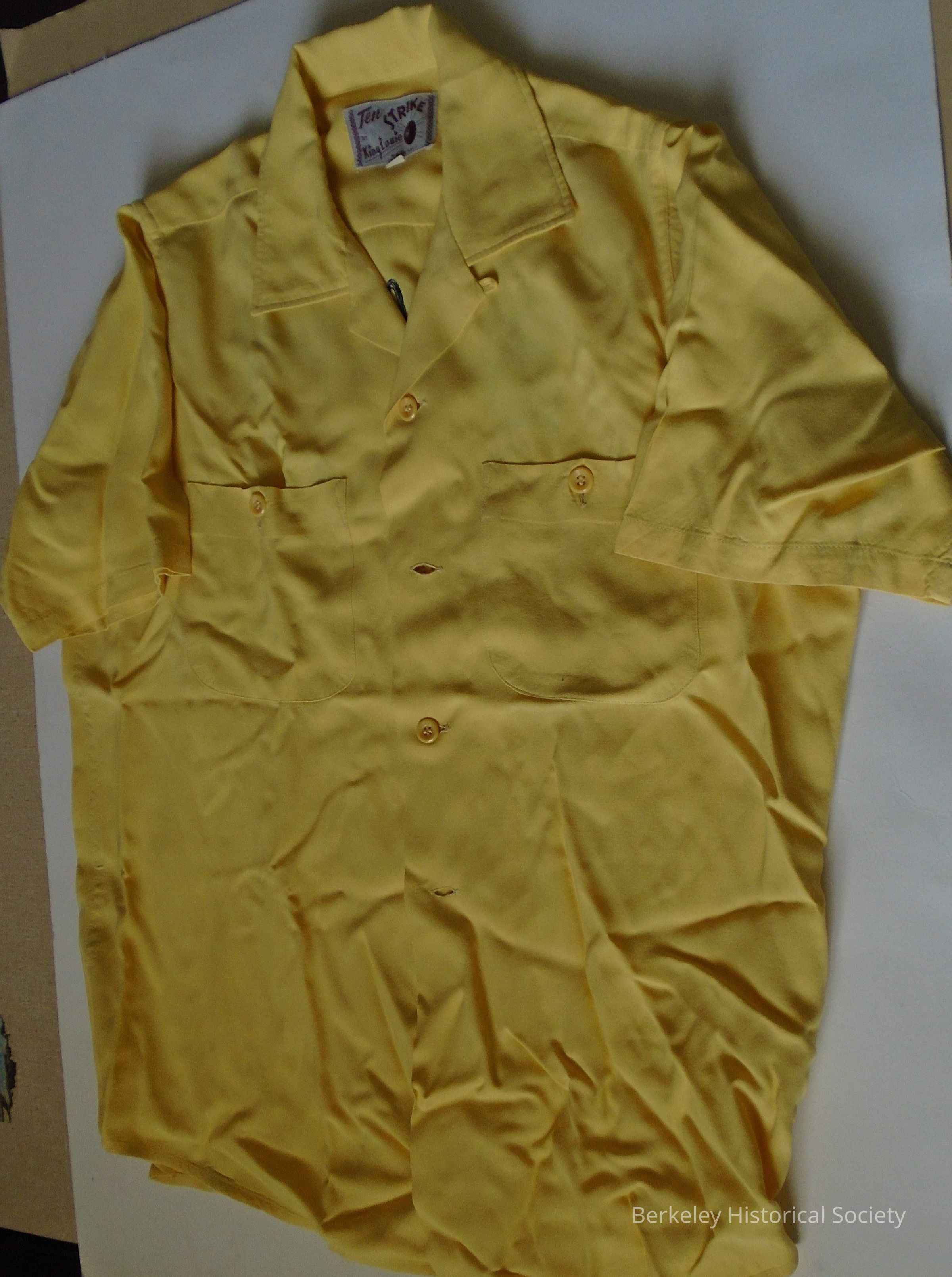 Short sleeved, yellow bowling shirt of a washable rayon blend. Sewn on the back in black: Berkeley Elks 1002. Label at neck: Ten Strike by King Louie, washable, size M. Pleats on each side in the back. 2 pockets in front with buttons.Made/Created