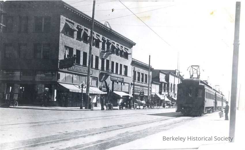 Shattuck Avenue at Center. Looking south at east side of street. Electric train at right side of photo.
