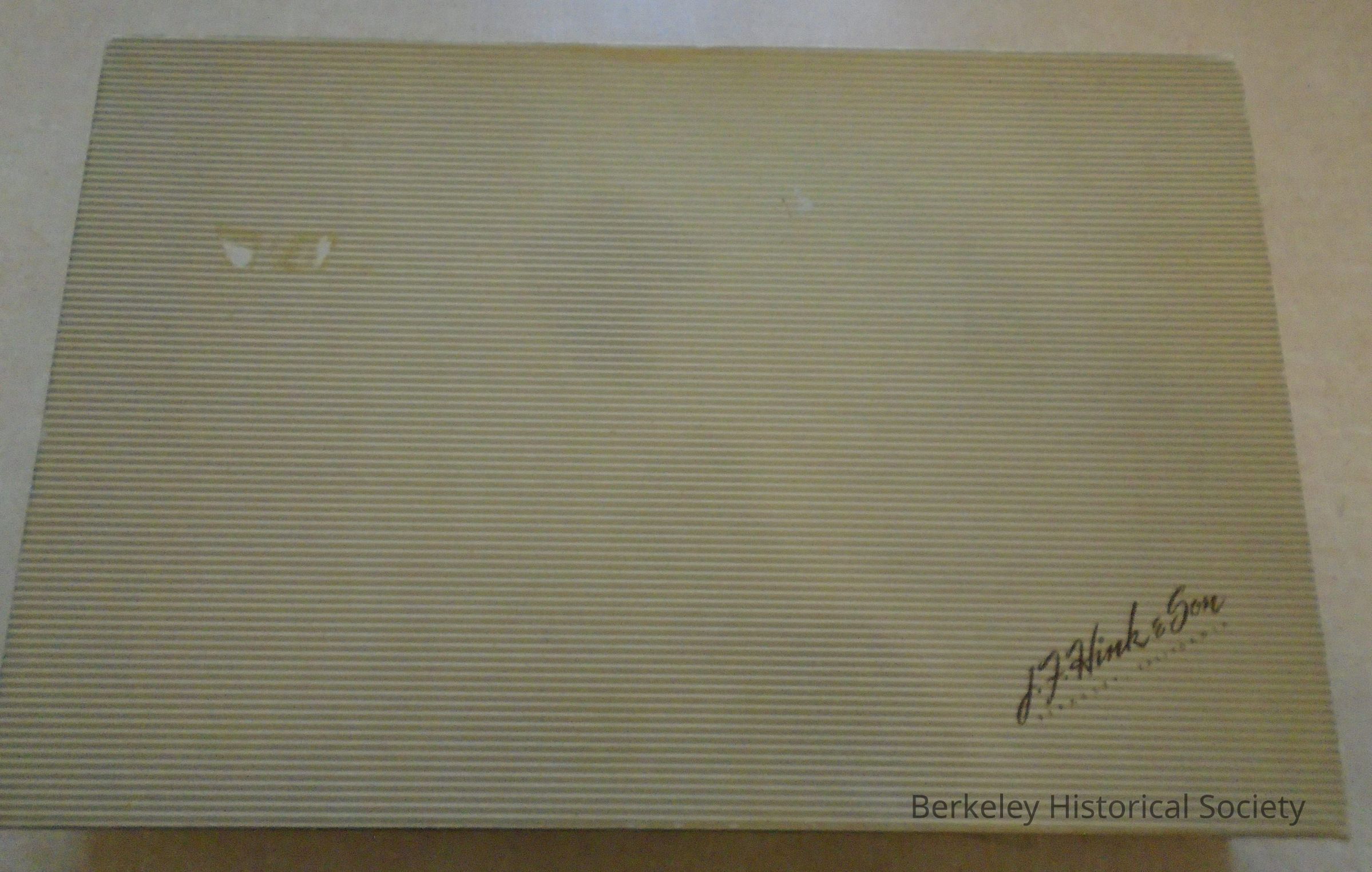 Cardboard and paper box with gold and white stripes. "J.F. Hink & Son, Berkeley California" on right, bottom corner.Made/Created