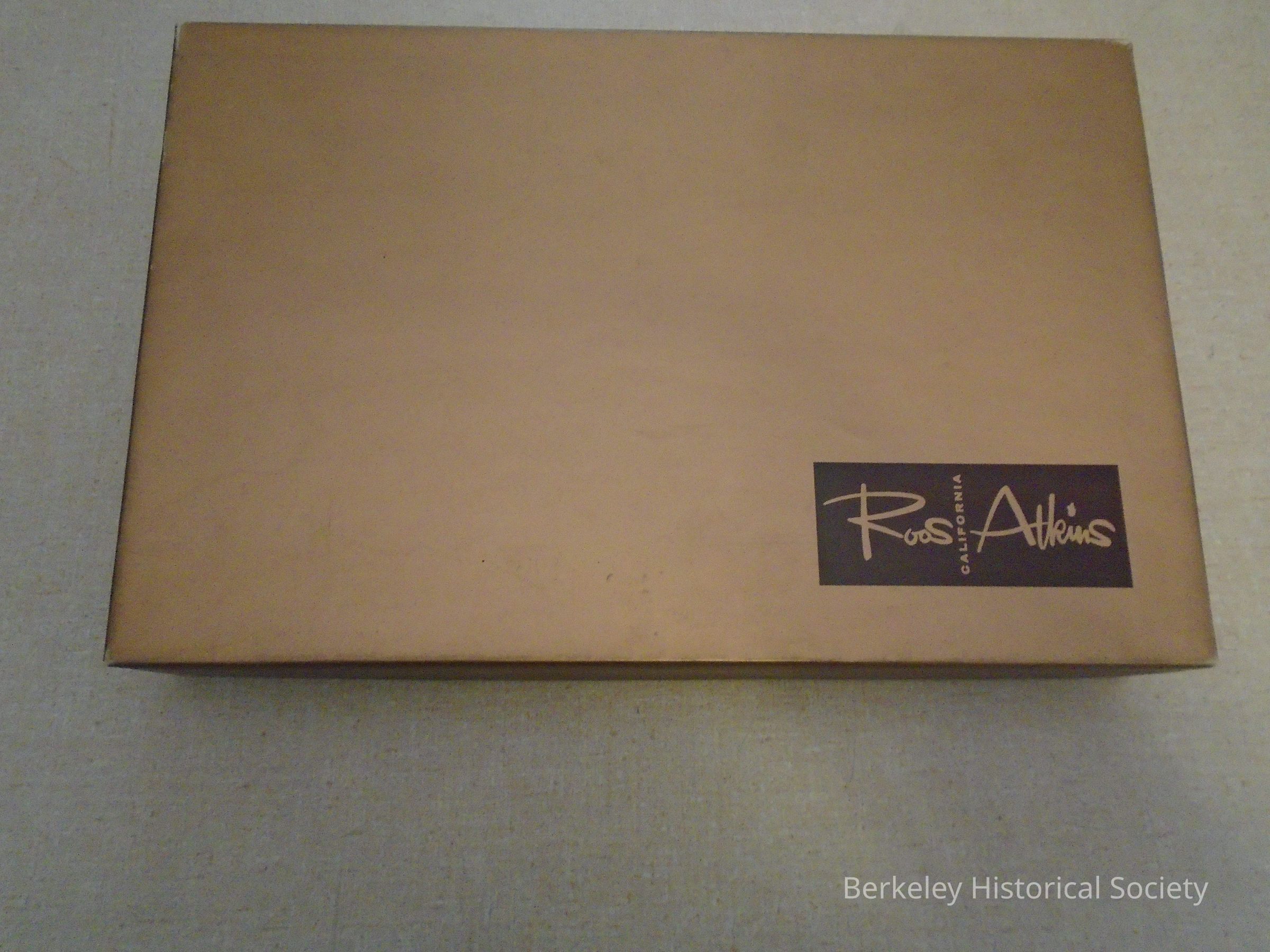 Cardboard box with gold and brown paper covering. Name on box: Roos Atkins, California. A family owned, retail men's clothing store in Berkeley, Oakland and San Francisco.Lexicon