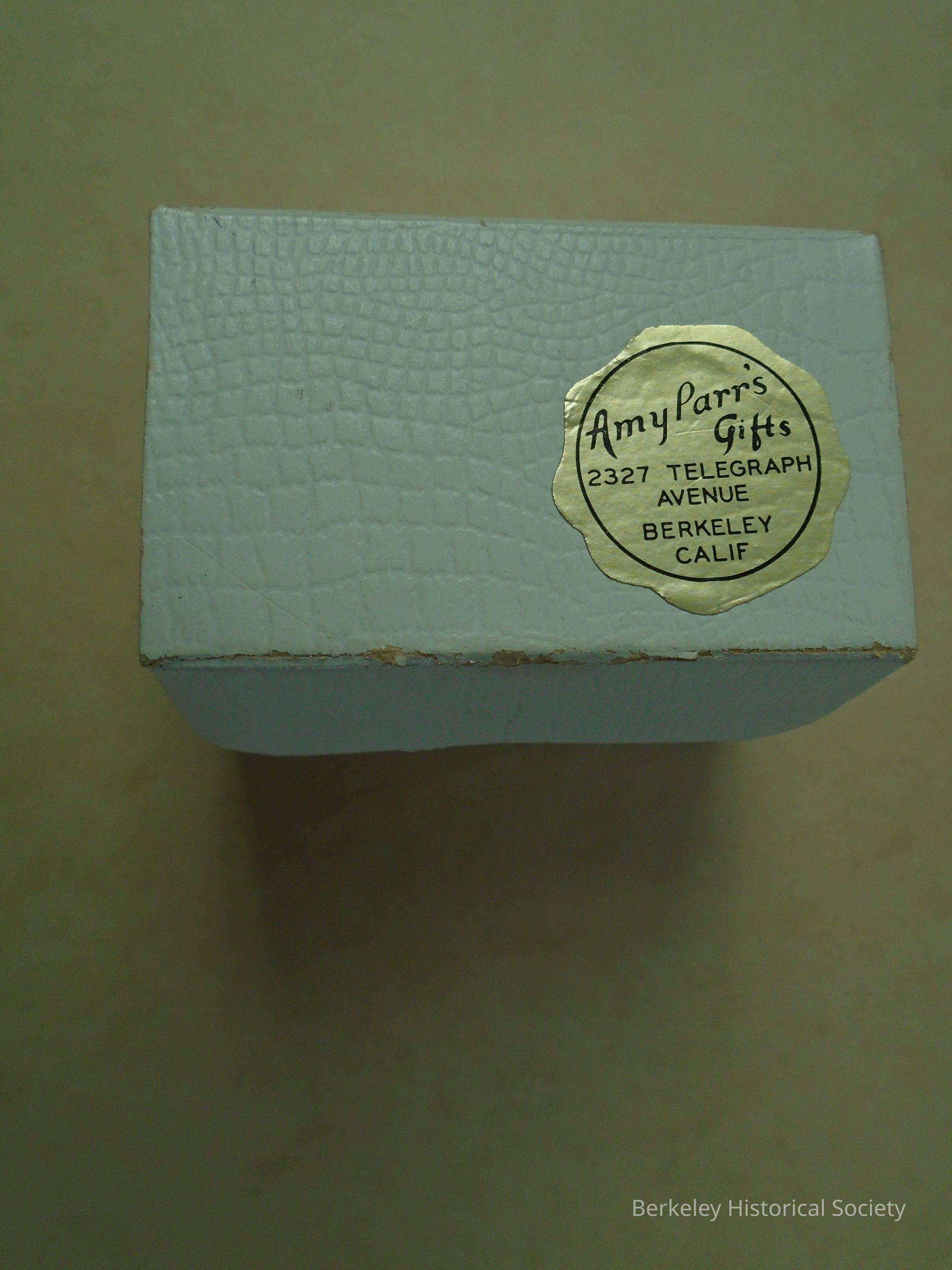 Small one-piece white cardboard box. Round, gold sticker on top with an irregular edge and black text: "Amy Parr's Gifts 2327 Telegraph Avenue Berkeley Calif."