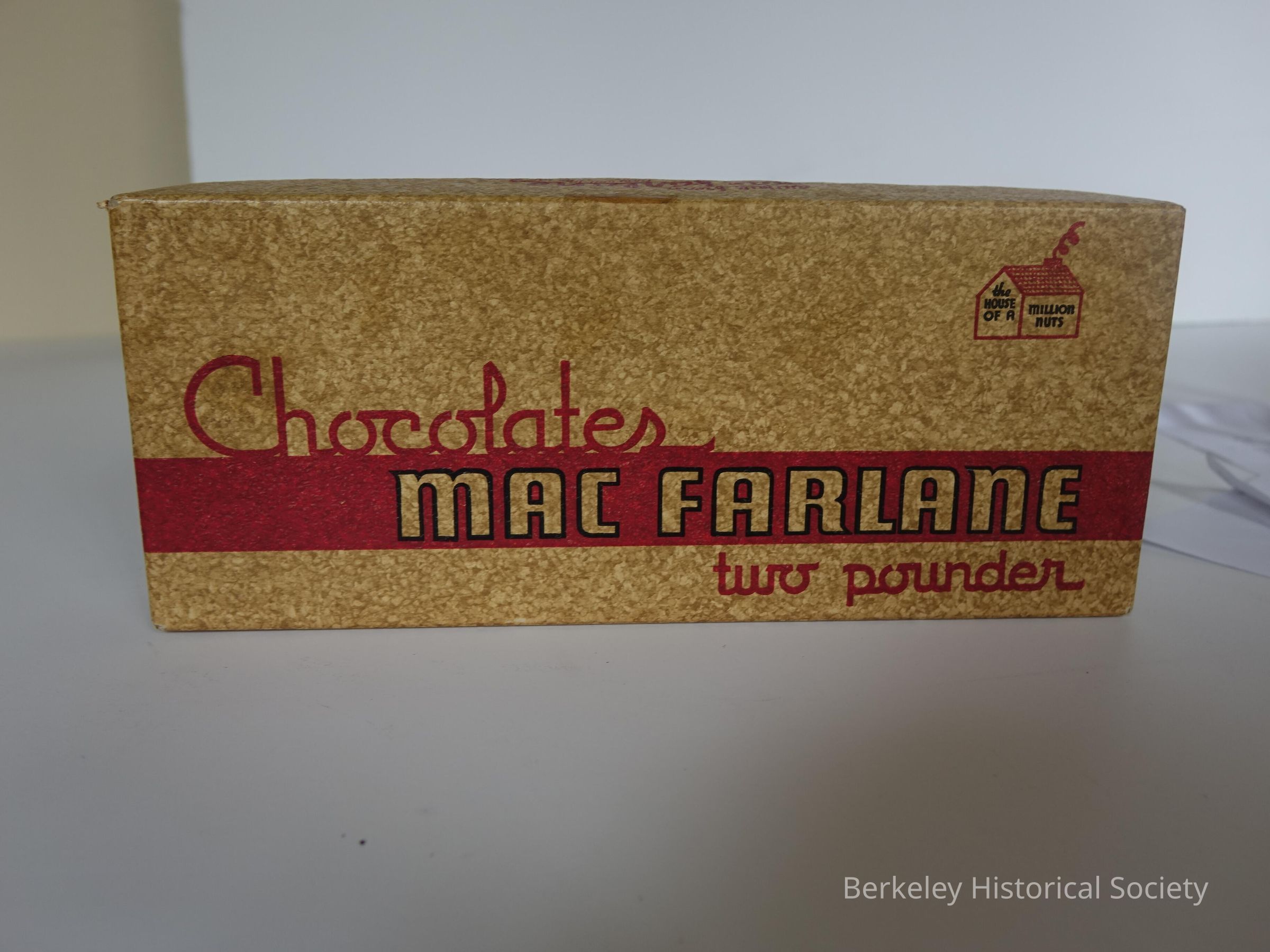Cardboard candy box with "Chocolates MACFARLANE two pounder" in red and a picture of a house around "the House of a Million Nuts". Sides show factory stores, "awful fresh (you will like my stuff)". Brown spotted box with red text. Company in business in 1941.Lexicon