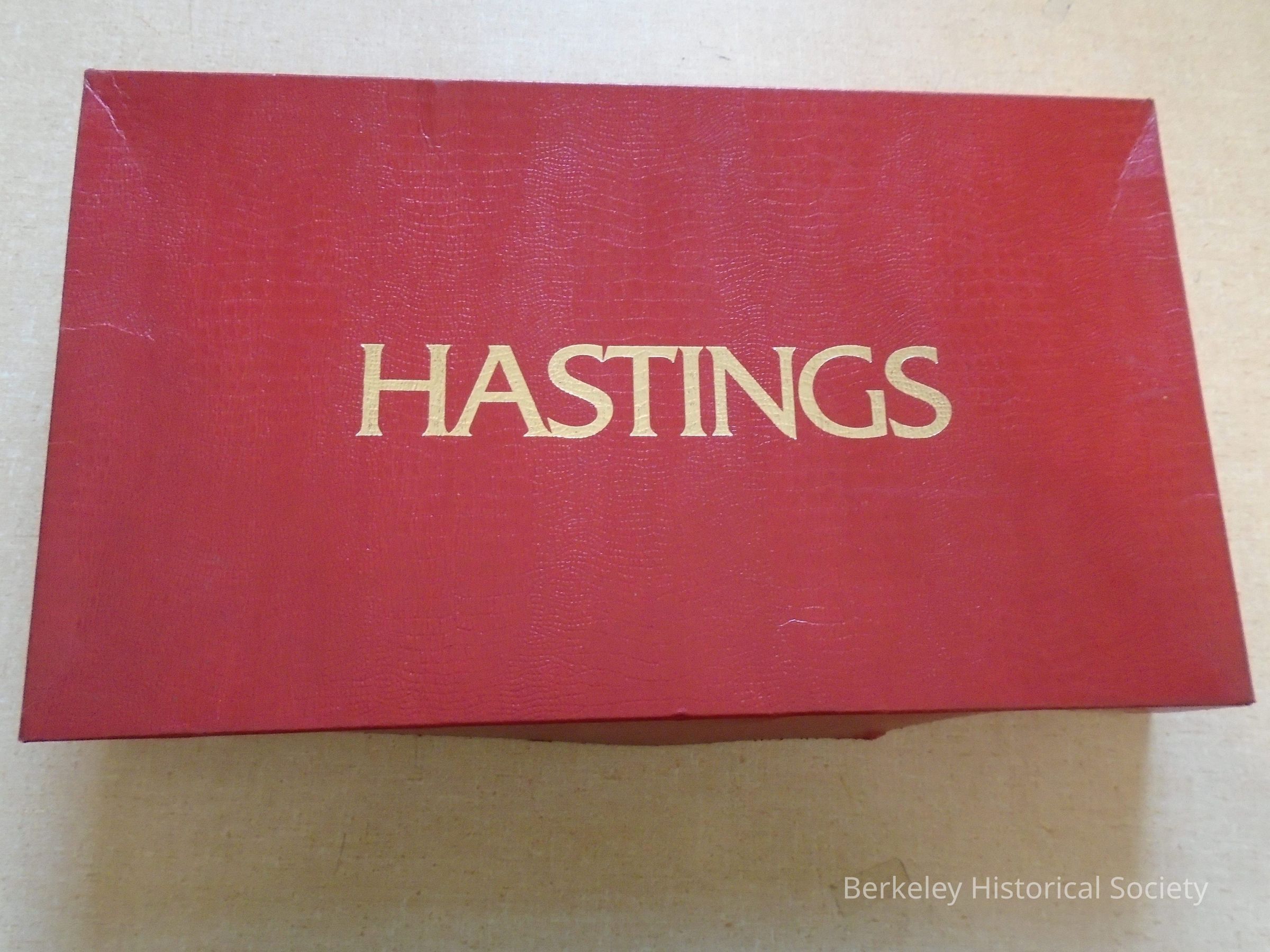 Red cardboard box (alligator print embossed) with HASTINGS printed on it in gold lettering. Clothing company (men's) with stores in Oakland and San Francisco too. Box folds to flatten.