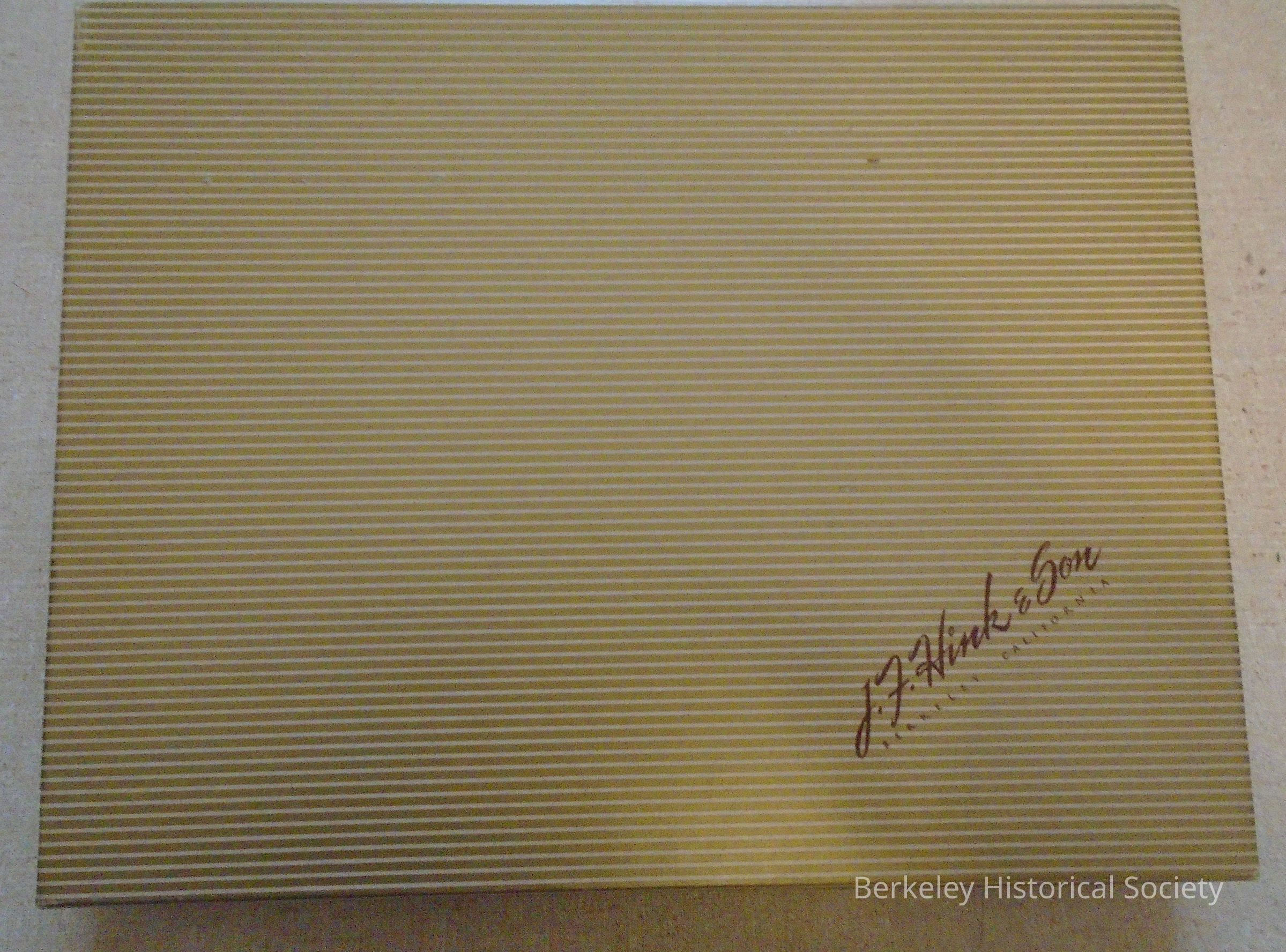 Cardboard & paper box, covered with gold and white stripe paper. "J.F. Hink & Son, Berkeley California" in bottom right corner on top.Made/Created