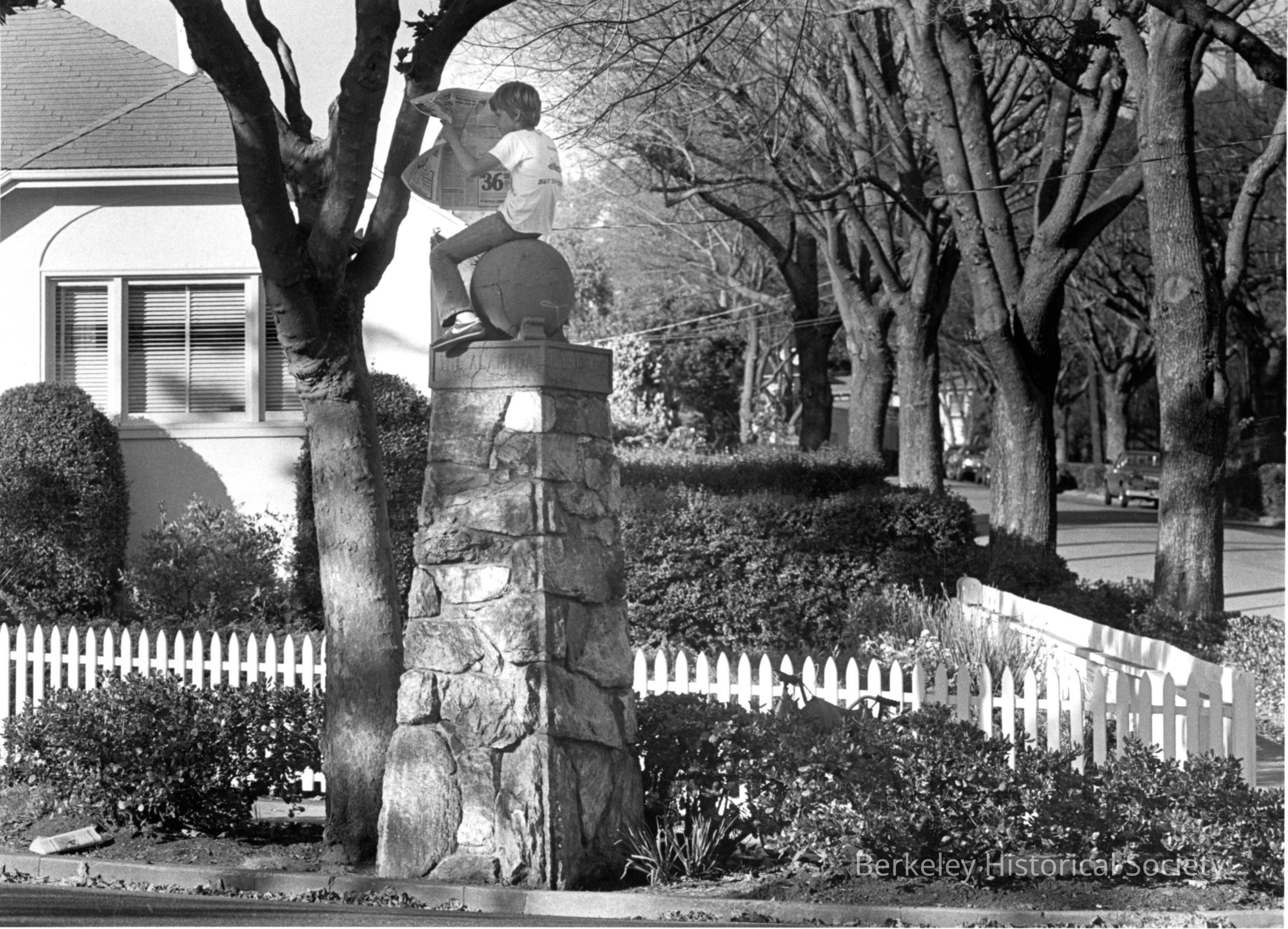 Charles Carus, age 12, taking a break while sitting on stone foundation street sign and reading a newspaper. Taken on the Alameda by MontereyMade/Created