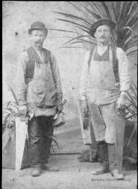 Formal portrait of 2 carpenters(?) holding tools, on Cabinet Card, by Henry Wohleb, Oakland. Name of second person not legible. Wohleb listed in 1894 directory!
