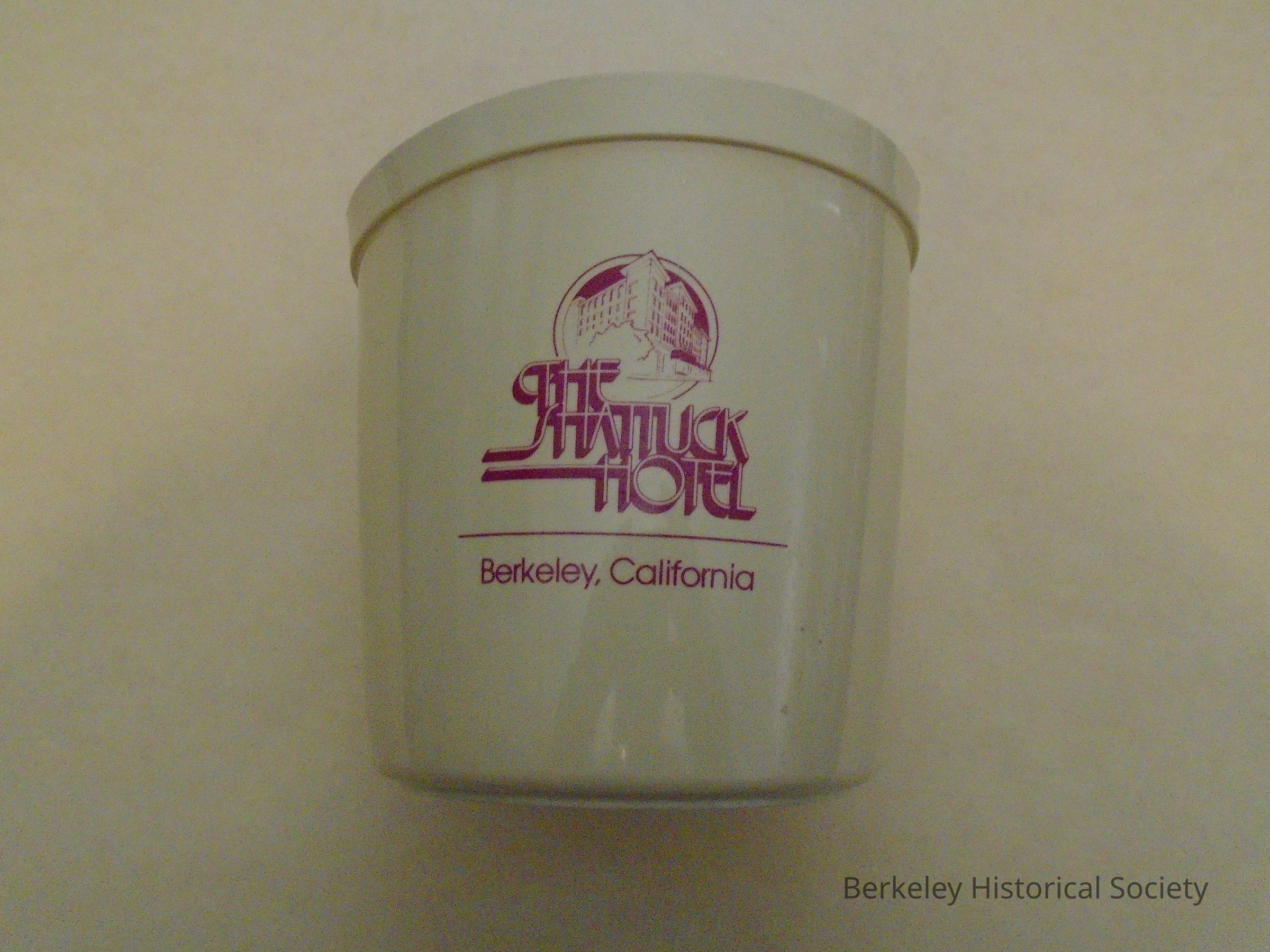 Tan, lightweight, plastic ice bucket. Shows The Shattuck Hotel Berkeley, California with hotel logo in a burgandy color. Rubbermaid mark on the bottom.