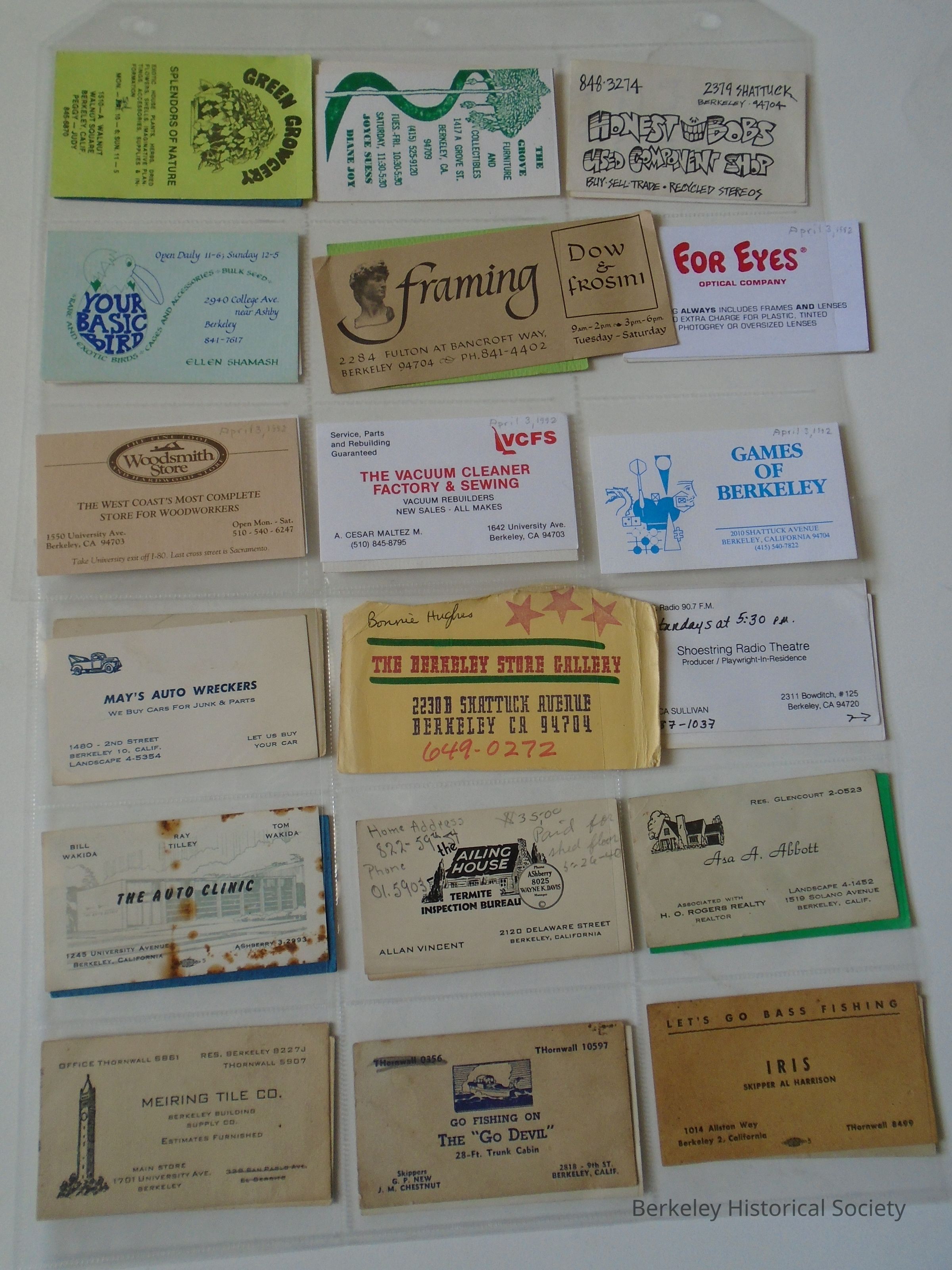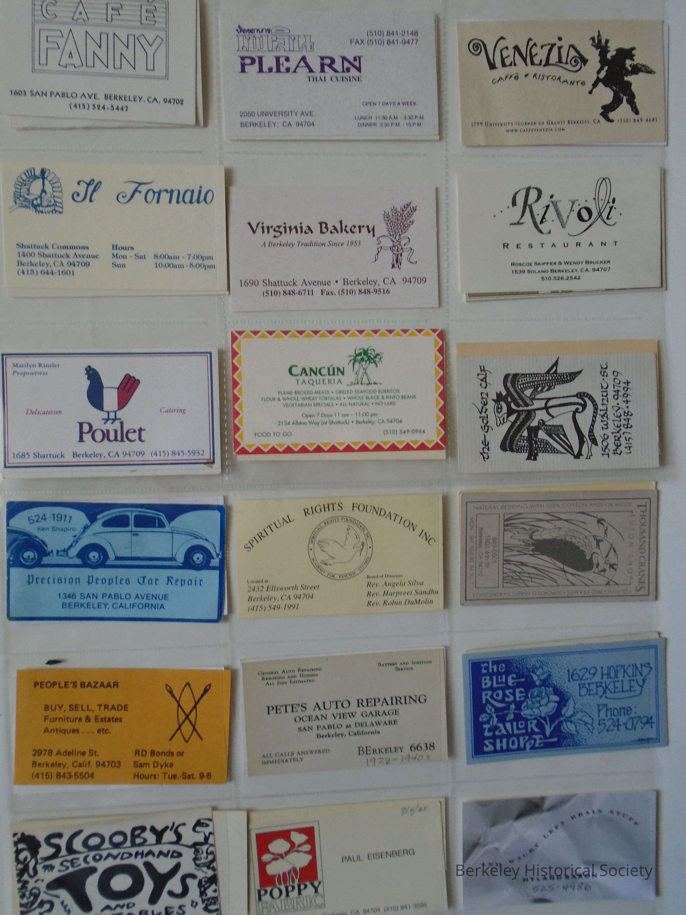 Miscellaneous collection of Berkeley business cards. Includes stores, restaurants, individuals, services, businesses, institutions. Ongoing collection.