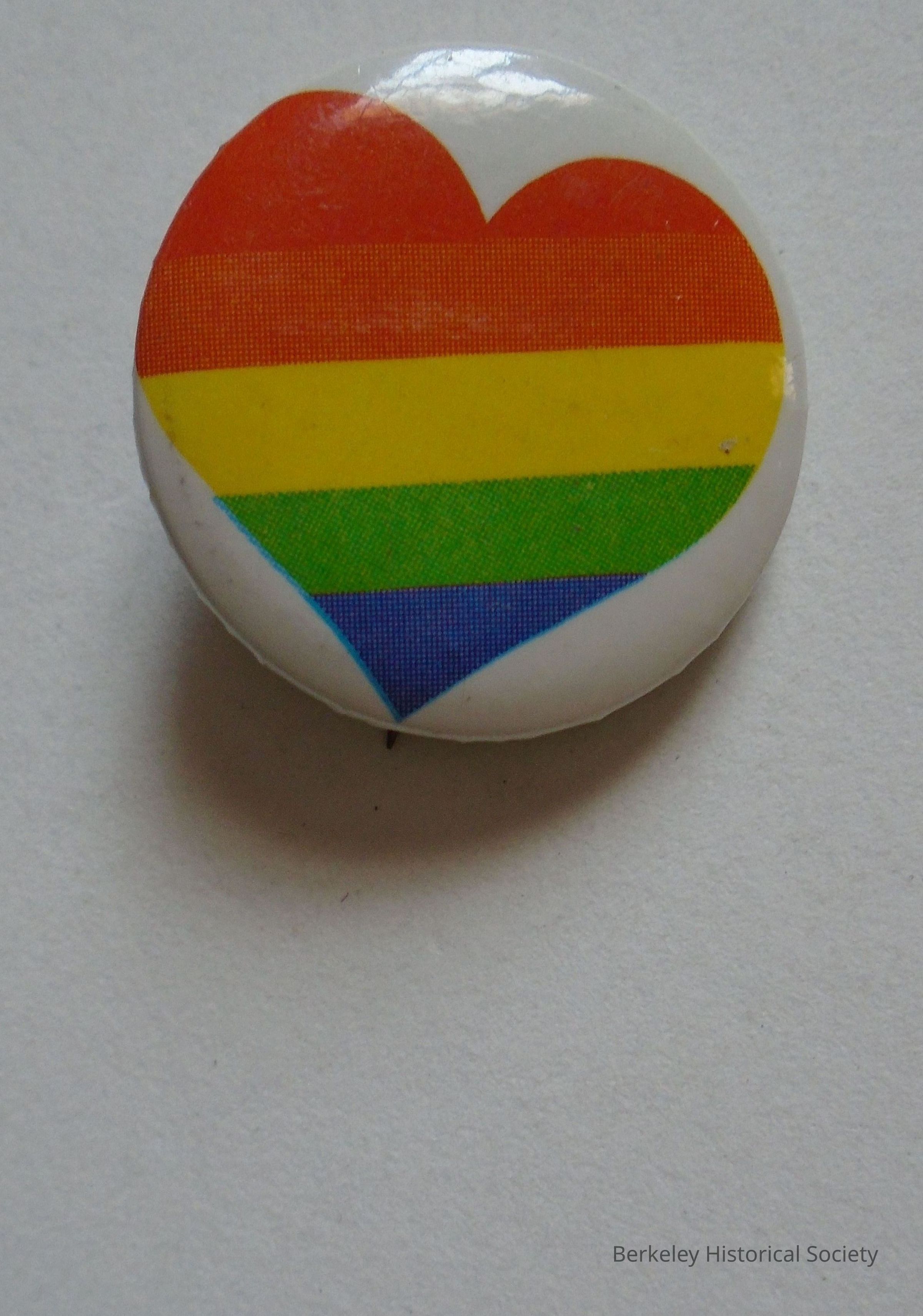 Round metal button, pin on back. Heart with multicolored stripes (gay pride symbol). Collected by J.B. Neilands, Professor at UC. Ran on Citizens Party ticket in l967. He died in 2008