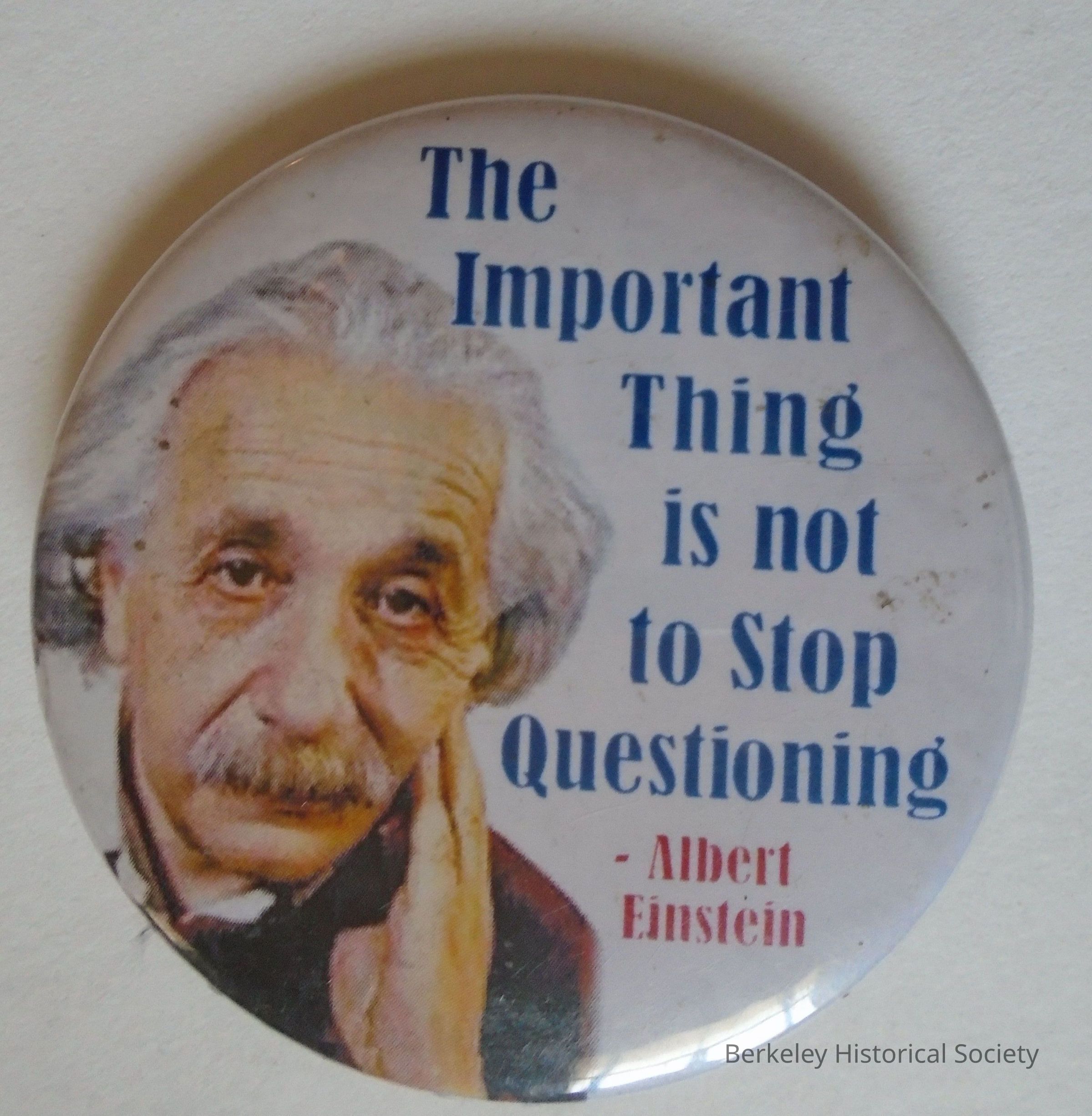 Round metal button with pin on back. Picture of Albert Einstein and text, attributed to him: "The Important Thing is not to Stop Questioning". Collected by J.B. Neilands, Professor at UC. Ran on Citizens Party ticket in l967. He died in 2008.