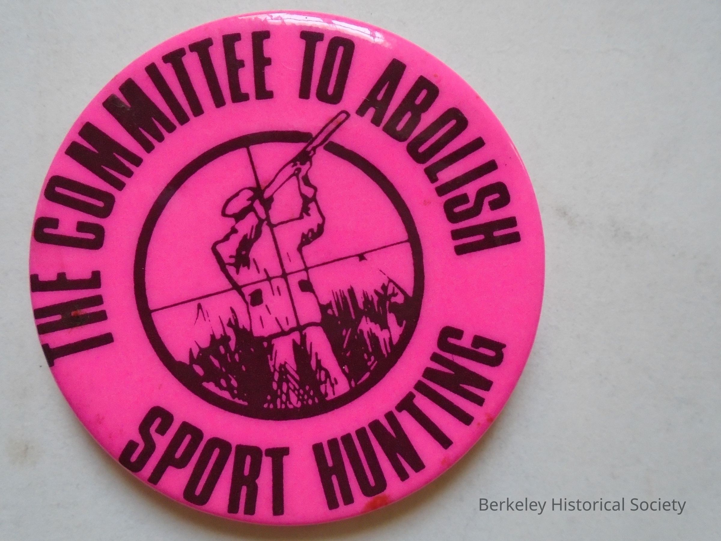 Round metal button with pin on back. Bright pink with a hunter with a shotgun in middle in an "eye sight". Around the outside "THE COMMITTEE TO ABOLISH SPORT HUNTING". Collected by J.B. Neilands, Professor at UC. Ran on Citizens Party ticket in l967. He died in 2008.