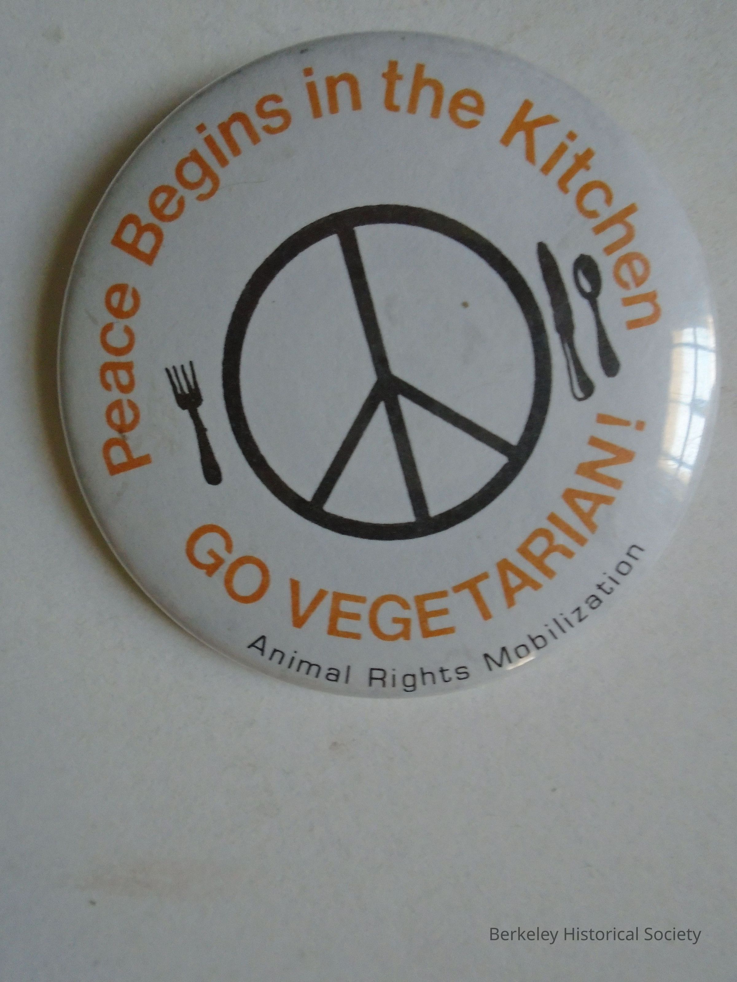 2 identical buttons: Metal button with pin on back in white, black and yellow. Picture of peace symbol in middle with knife, spoon and fork on either side. "PEACE BEGINS IN THE KITCHEN, GO VEGETARIAN! Animal Rights Mobilization". Collected by J.B. Neilands, Professor at UC. Ran on Citizens Party ticket in l967. He died in 2008