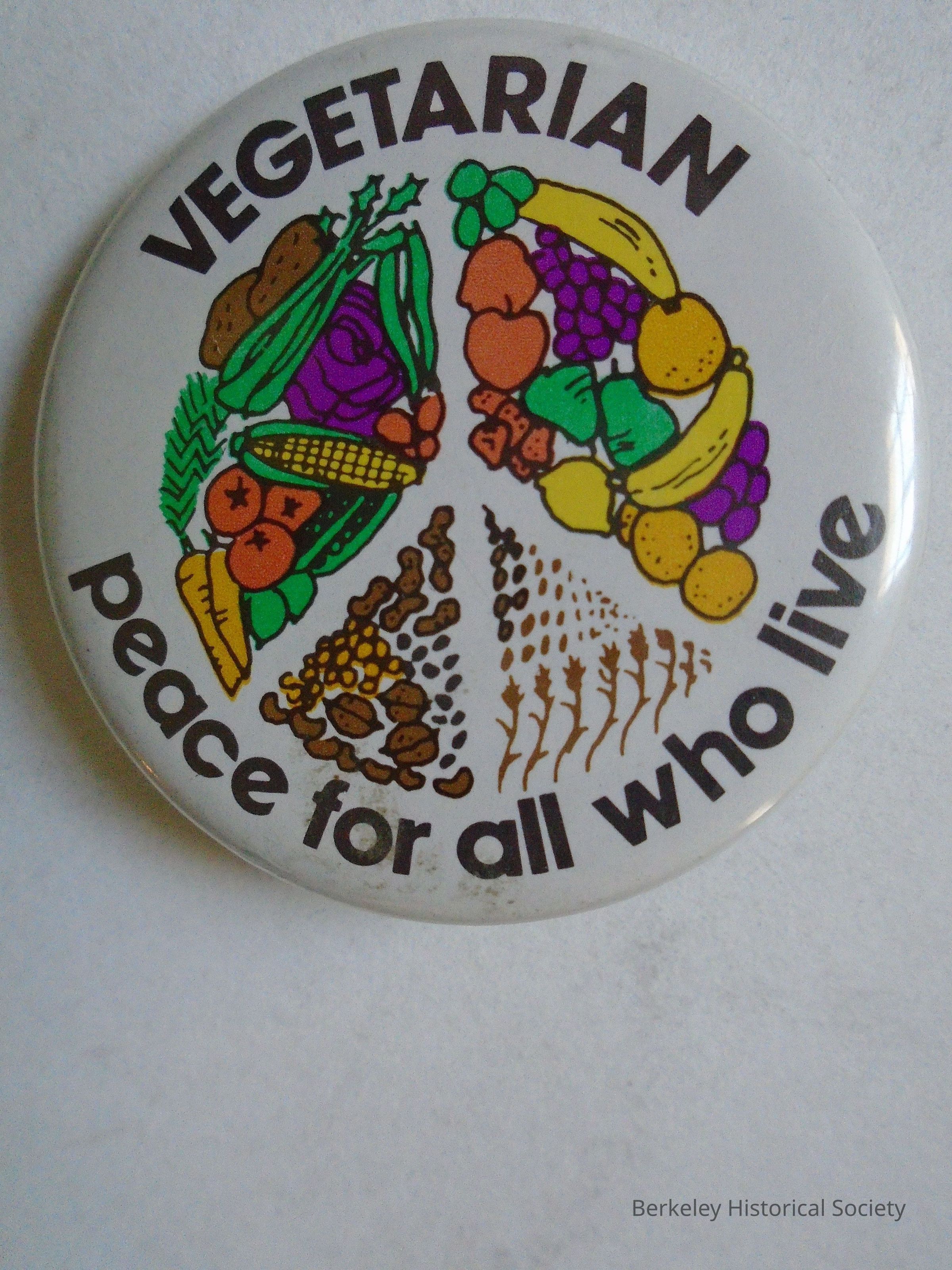 Round metal button with pin on back. Peace symbol in the middle with pictures of vegetables and around the outside: "VEGETARIAN peace for all who live". Collected by J.B. Neilands, Professor at UC. Ran on Citizens Party ticket in l967. He died in 2008.