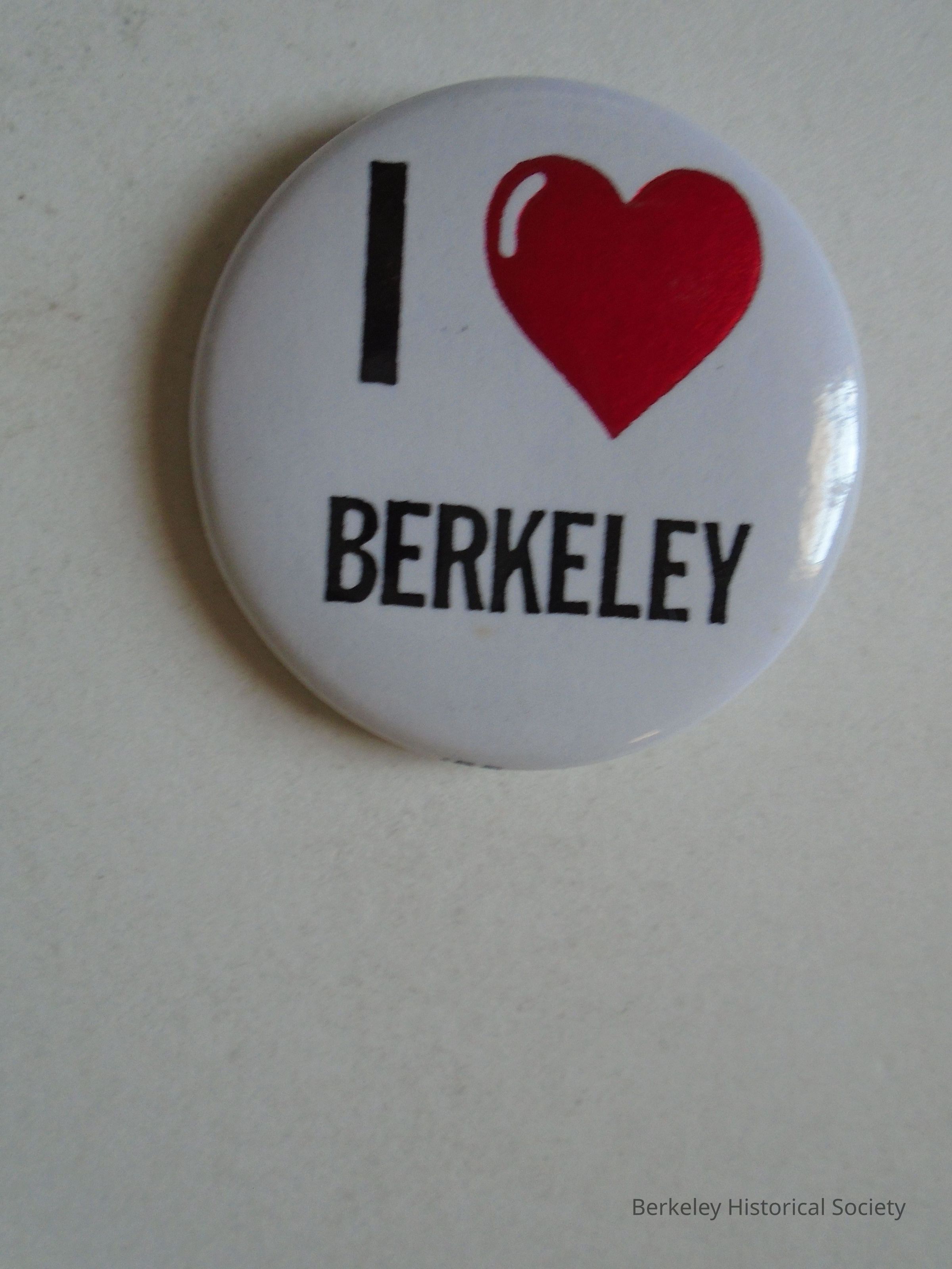 Round, metal button, pin on back. White background, red heart, black text: "I (red heart) Berkeley". Sticker on the back side reads "Berkeley Chamber of Commerce" and penciled in "1992".