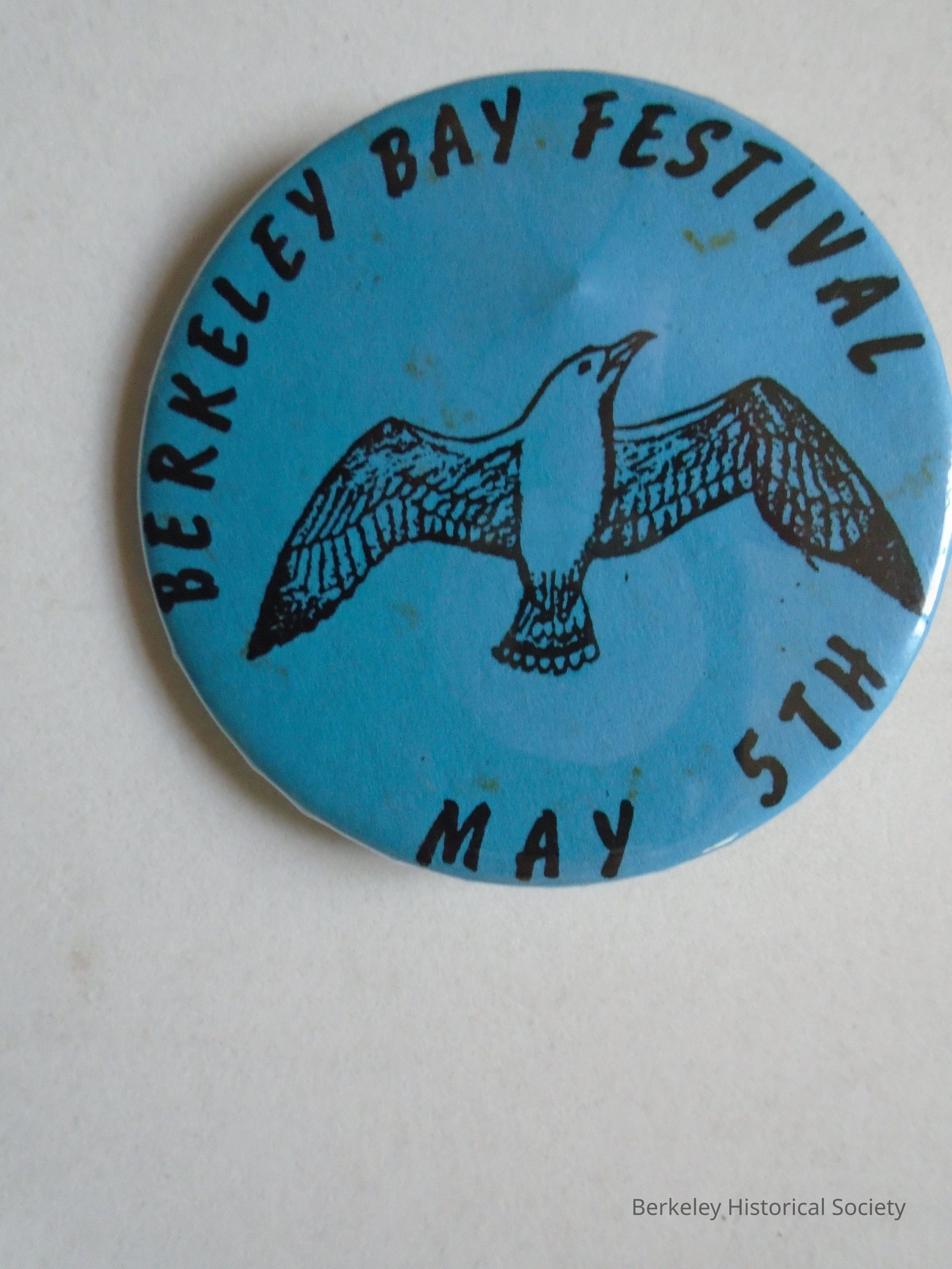 Round, flat, metal button. Aqua blue background with picture of a seagull and text in black: "BERKELEY BAY FESTIVAL MAY 5TH".