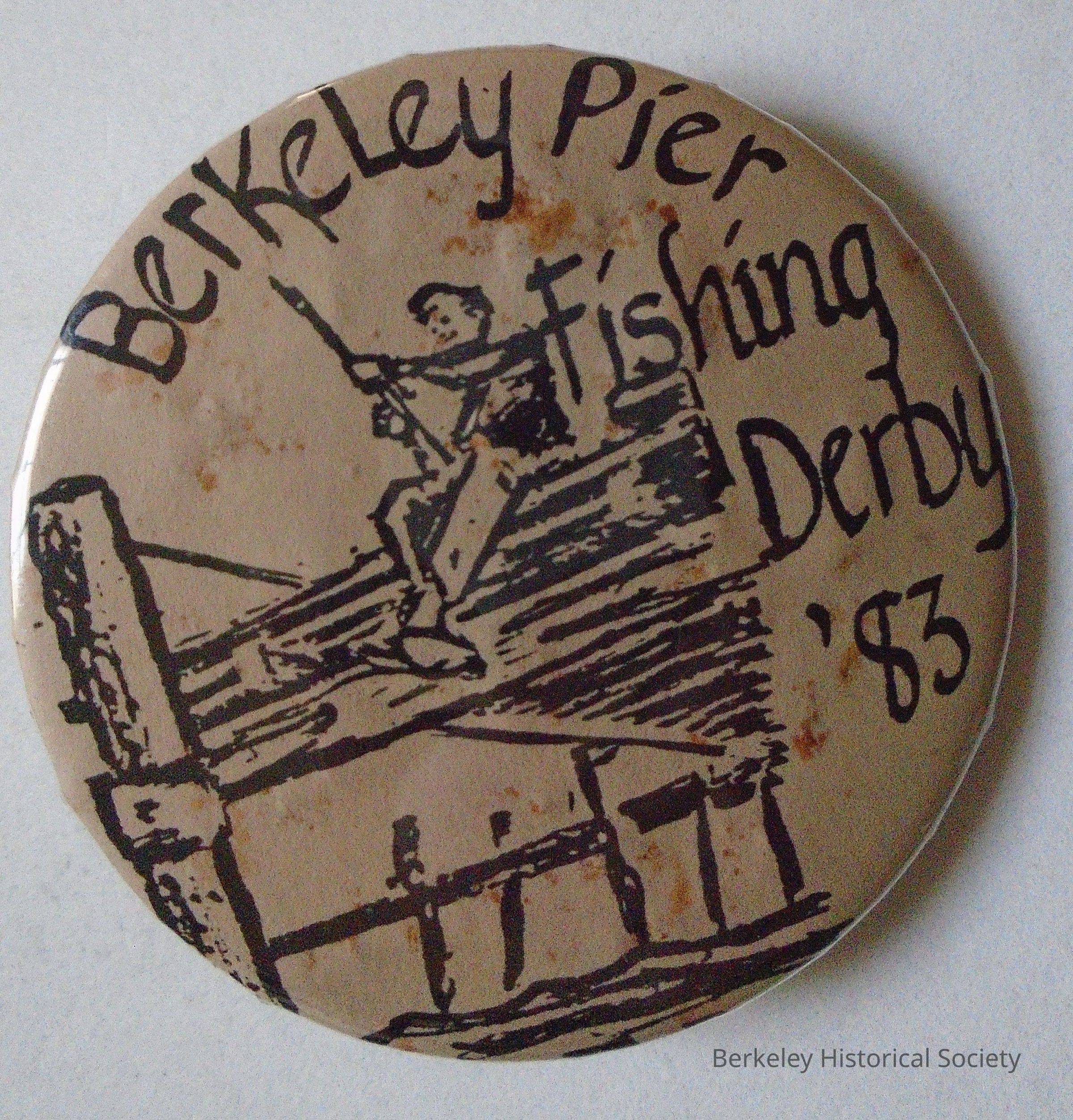 Round metal button with beige paper and black text: "Berkeley Pier Fishing Derby '83". Picture of a person sitting on a pier holding a fishing rod.
