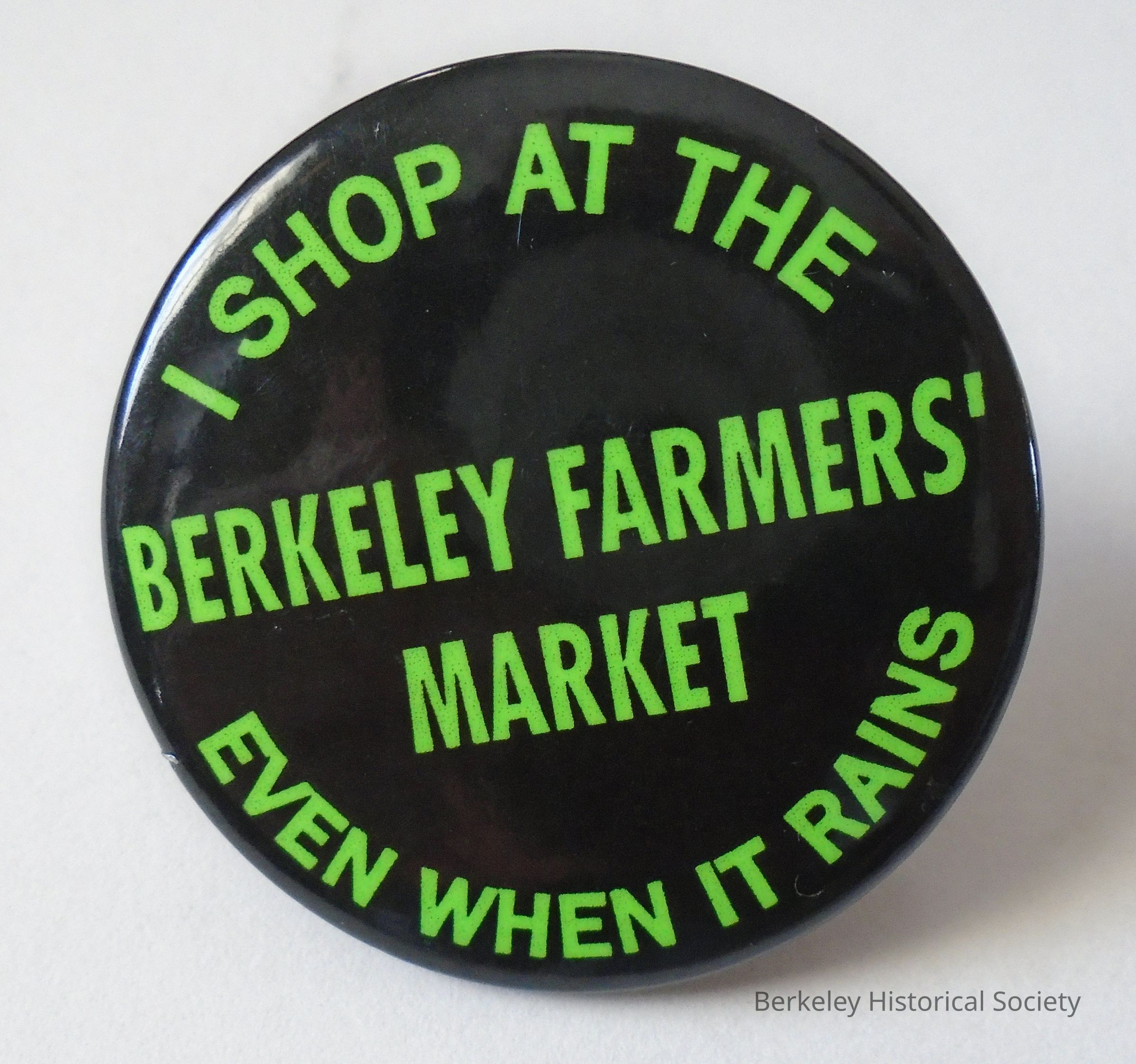 Round metal button with pin on back. Black with kelly green text: " I SHOP AT THE BERKELEY FARMERS' MARKET EVEN WHEN IT RAINS". Collected by J.B. Neilands, Professor at UC. Ran on Citizens Party ticket in l967. He died in 2008.