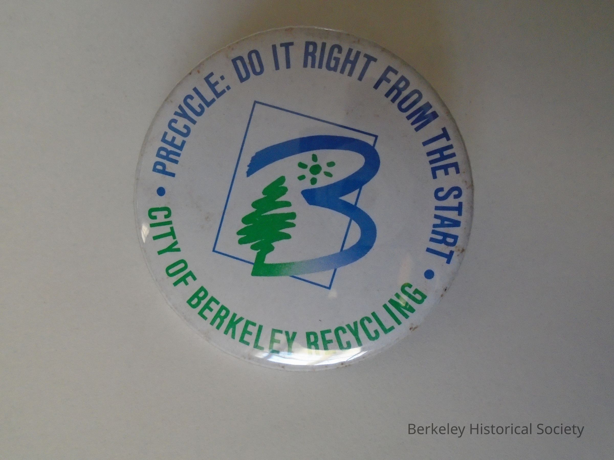 Round, white button with metal back. Blue & green text "RECYCLE: DO IT RIGHT FROM THE START. CITY OF BERKELEY RECYCLING". Also blue & green logo: "B" with tree and sun. Duplicate of 1978.002.130.