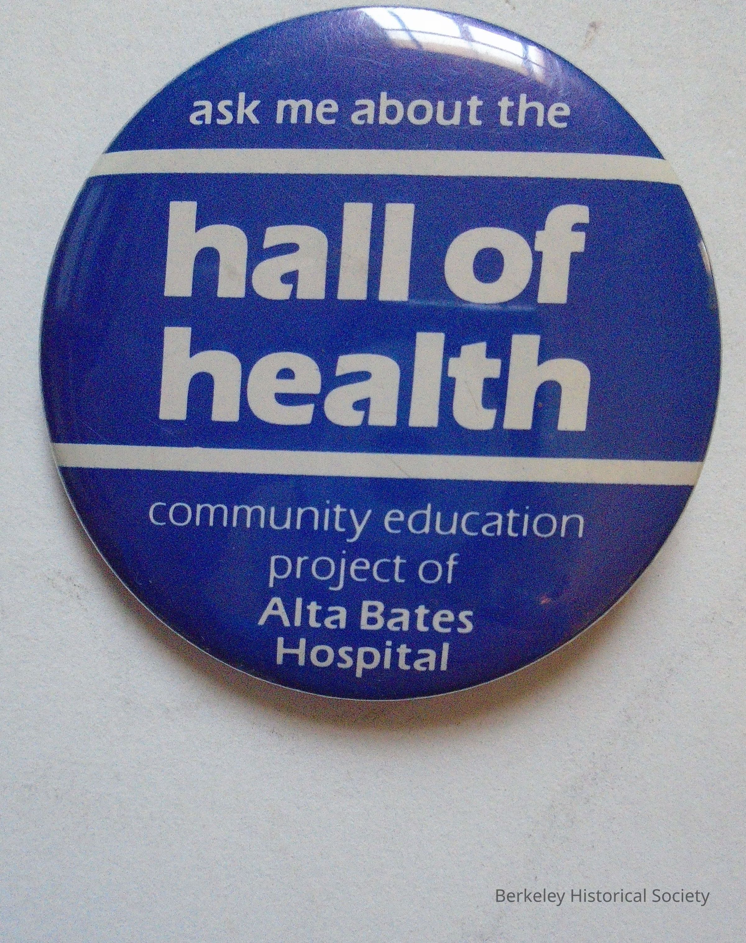 Round, metal button with blue background and white lines and text: "ask me about the hall of health community education project of Alta Bates Hospital".